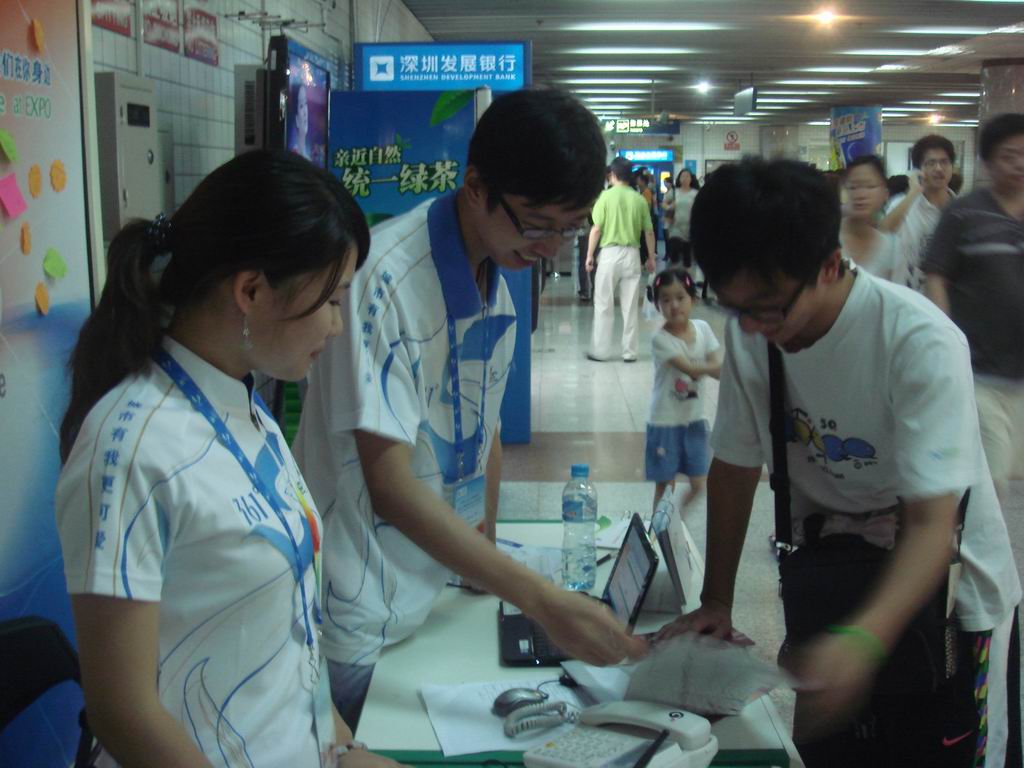 由于是暑期世博志愿者第一天上岗,范柳斌同学等人慰问了志愿者们,了解志愿者们的工作情况并想办法在第一时间解决志愿者们在工作时遇到的问题,并给志愿者们分发了清凉油等降暑小用品,同时工作小组成员用相机记录下志愿者们认真工作时的情况,并给予他们鼓励。