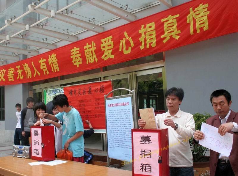 |  昨天中午,我校逸仙校区广大师生在“师生活动中心”门口参加赈灾捐款活动,本次活动由高职学院党办、工会、团委联合举办,在“爱的奉献”的歌声中,八个部门党支部和高职学生会及不少外来人员自发到捐款点捐款,截止到下午3时,共募集捐款人民币88953.56元,其中学生捐款18003.56元。 5月12日四川汶川特大地震发生后,逸仙校区广大师生每天都被震区的一条条新闻所震憾,党中央、国务院、中央军委在第一时间迅速作出反映,温家宝总理冒着余震的危险深入灾区,慰问灾民,鼓励受灾群众。温家宝总理说,只要人在,用我们的双手就能重建美好家园。他的感人行动充分体现出一个大国总理的风范和国家领导人与广大群众血脉相连的深厚感情,也引起了世界重要媒体的一致好评。当学校党委工会关于开展捐助灾区的通知下达后,逸仙校区广大师生早就作好了准备。短短几个小时里,高职24个班级的学生就以班为单位集中了所有捐款,同学们慷慨解囊,由班干部代表到捐款点捐款,其他同学则早早赶到教室上课,大家表示要在捐献爱心的同时,更加刻苦努力地学习,早日报效祖国。在逸仙校区承揽保洁保绿和驾培工作的外包员工们也不甘落后,早早来到捐款处代表全体外包员工捐献了1170元。  震灾无情人有情,奉献爱心捐真情。逸仙校区这次捐款活动从组织到实施只用了短短几个小时,捐数目之大超过历次学院开展的捐助活动,充分体现了在工程大党政的领导下,师生们的爱心和凝聚力得到了进一步的增强,也是创建和谐校园取得的可喜成果。 |