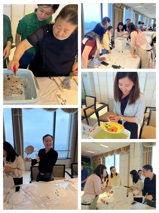 漆扇是以扇子为载体,运用非遗漆染工艺手工染制而成的艺术品。活动伊始,专业老师详细介绍了漆扇的历史背景、文化意义以及DIY制作流程。在专业老师的指导下,老师们迫不及待地开始制作漆扇:先将调制过的传统大漆滴入水中,再搅散纹路,让大漆在水面上自由扩散、融合,形成富有动感、随机性、独一无二的抽象图案,接着把一把把干净且空白的纸扇沉入水中,让大漆留下水波纹路形成漂漆效果,极具国风审美的非遗漆扇就大功告成了。