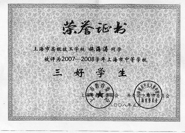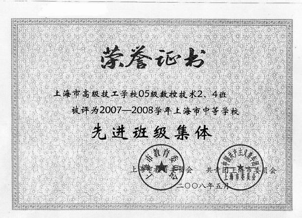 由上海市教育委员会以及共青团上海市委员会共同主办的2007-2008学年上海市中等学校三好学生、先进班级集体表彰大会暨“时代发展与青年责任”主题论坛于 大会由团市委学校部部长金梅主持,科教委党委书记宣布表彰决定,各位领导向获得各种荣誉称号的同学老师颁发荣誉证书。团市委书记潘敏在讲话中提出了要知行合一,做一个内心丰富的人。大会最后由获奖学生代表向全市中学生发出倡议,以力所能及的实际行动声援、帮助四川地震灾区的青少年度过难关,重建家园。这时全场与会人员全体起立,举起左手,高喊“以青春之心守望相助,以青春之力众志成城”,场面感人,催人泪下。 高级技校 | |