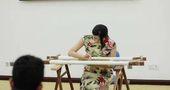 随后,由钱佳韵和金雨婷同学演绎的顾绣技艺,现场展示了中国古代的缝纫工艺。顾绣集传统书画艺术与刺绣技艺于一体,故又被称为“画绣”。顾绣经国务院批准列入第一批国家级非物质文化遗产名录,以其独特的魅力,已然成为东方瑰宝,这也是时代传承中不可或缺的“技艺符号”。