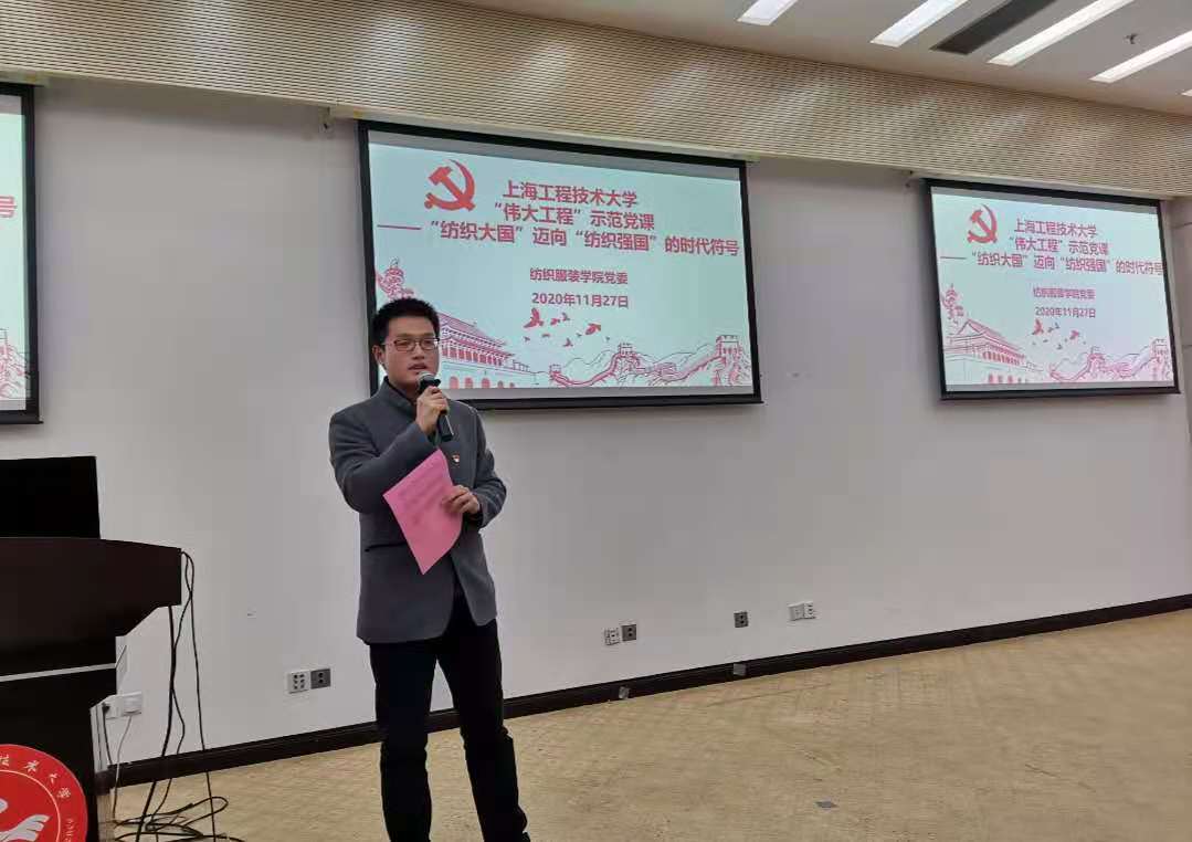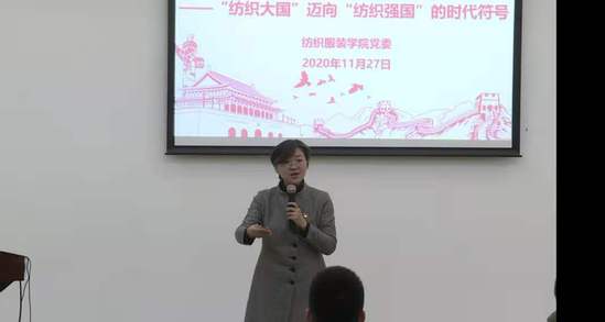 11月27日晚,在图文信息中心第三报告厅内爆发出一阵阵热烈的掌声,会场内正在进行“伟大工程”系列示范党课授课,主题是“纺织大国”迈向“纺织强国”的时代符号。主讲教师团队由纺织服装学院党委师生党员组成,听课对象包括学院党委基层党支部书记、委员以及预备党员们。党课由服装设计与工程党支部书记孙光武主持,他幽默风趣的主持风格引发场内连连的掌声。