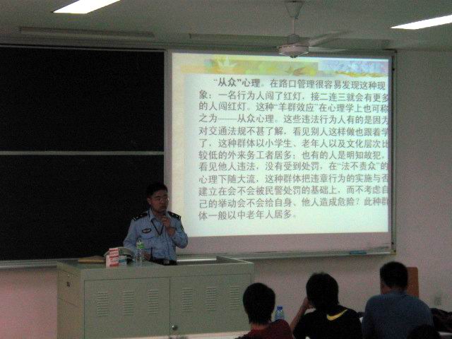 为配合 高警官指出,目前大多数人的交通法规意识依然淡薄,违反交通法规者大有人在,其中不乏一些大学生。讲座中,高警官围绕一些违法者的违法心理展开了分析,其中囊括了“漠视”心理、“从众”心理等,这些分析使在场的同学们了解了违反交通法规的人的心理状态,同时也时刻提醒着同学们要将交通法规牢记于心。当说起大学城的交通安全时,高警官重点讲述了大学城的黑车问题,指出黑车无运营证明、车辆安全性低、驾驶员素质低下等存在潜在的危险因素,并举了一些血淋淋的例子,以此告诫同学们不要乘坐黑车。 讲座最后,高警官向同学们阐述了大学生日常交通安全注意事项,并祝福大家能够出行平安,并且为奥运期间的交通安全尽自己的一份力量。 | |
