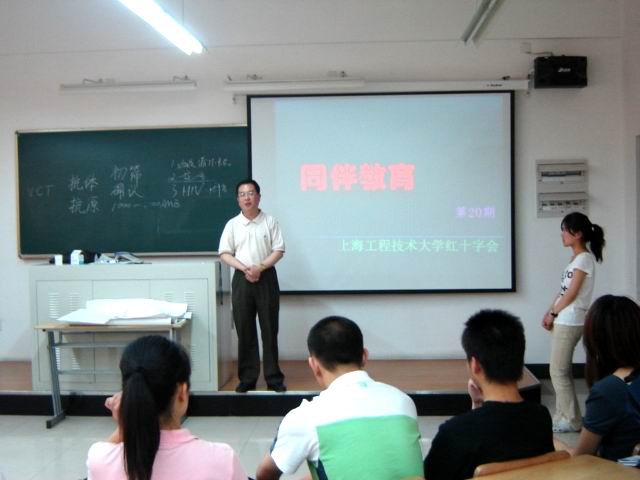 当天的活动主要以专业知识讲座、观看视频和案例分析讨论三部分展开,席期间穿插了趣味游戏、情景互动教育和现场模拟演示。通过这种新颖的教育形式,让大家获得了艾滋病预防、生理常识、安全性行为以及青少年性心理等方面的基本知识,并能够尽快地传播开来,影响身边更多的同学 上海市红十字会青少年工作部部长杨钧仪先生对整个活动做了监督和指导,他看了化学化工学院同学积极参与的热切场景后倍受感染,也饶有兴致地走到大家中间,告诫我们青年人做事一定不能脑子发热,要慎重;对待艾滋病感染者,要心怀红十字会的“非评判原则”,真正把他们作为不幸的病人来关爱。 大家以热烈的掌声来回应杨部长精彩真挚的讲话,同时发自内心的掌声也昭示着大家致力于防艾抗艾的决心。结束以后大家情绪激动,都纷纷表示一定要把在学习班上学到的知识在身边传播开来,真正做到抵制艾滋,关怀病人的活动宗旨。 | |