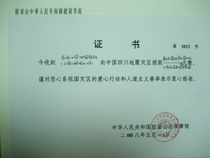 我校中韩多媒体学院0721061和0721062班48名同学本学期在韩国东西大学交流学习,在获知祖国四川大地震造成巨大的人员伤亡与国家财产损失后,他们自发地组织捐款,在蒋正清与徐嘉伟两位带队老师的带领下,于五月末向中华人民共和国驻釜山总领事馆递送了为四川灾区募捐的114000元韩元和4530元人民币。 两位老师不仅在韩国与同学们一起捐款,并及时联系到党组织,多次捐款,并通过网络关注国内的情况。 这些在海外的师生,他们处在异乡,在自己经济条件拮据的情况下,希望能为灾区表达自己的一份心意。大家在对此次四川省地震灾害造成的人员伤亡深感悲痛。同学们对伤亡人员及其家属表示深深的哀悼,并希望受伤人员尽快康复,失踪人员早日回归家园。我们相信,这些饱含着师生爱心的捐款,将给灾难中的同胞带去废墟中重建家园的勇气和力量! | |