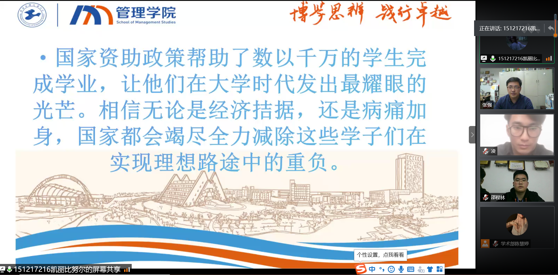 为更好地贯彻落实和宣传高校家庭经济困难学生资助政策,促进学生的成长成才,同时为了在同学们当中树立良好的资助典型与榜样,激发学生自我发展新动力。12月1日下午,管理学院通过腾讯会议组织开展了资助政策宣传暨国家奖学金获得者经验线上分享会。管理学院党委副书记程玉莲老师、张强老师,学生事务辅导员凌剑秋老师、邵程林老师出席本次会议。资助政策宣传和经验分享分别邀请到了学院资助宣传大使凯丽比努尔·尔肯、国家奖学金获得者杨广和王文华同学。
