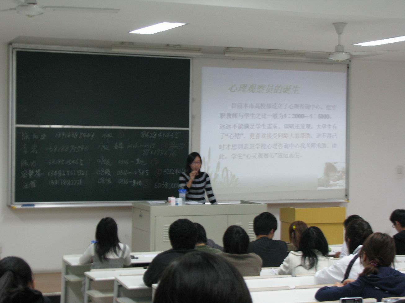 |  2008年11月4日晚上18:00,管理学院在F106召开了全体心理观察员培训课程的第一讲——“怎样做好心理观察员”,培训由学院分管心理健康教育的辅导员李柳维娜主持。 李柳维娜老师简要介绍了心理观察员的诞生。2001年3月16日教育部印发了《教育部关于加强普通高等学校大学生心理健康教育工作的意见》。《意见》要求要认真开展大学生心理健康状况的摸排工作,积极做好心理问题高危人群的预防和干预工作,要特别注意防止因严重心理障碍引发自杀或伤害他人事件发生,做到心理问题及早发现、及时预防、有效干预。通过调研发现,大学生有了“心结”,更喜欢接受同龄人的帮助,只有迫不得已时才想到走进学校心理咨询中心找老师求助,于是学生“心理观察员”应运而生。 李柳维娜老师要求心理观察员认真对待工作,明确自己的工作职责。心理观察员的职责是及时搜集班里同学的心理健康信息,对有异常心理倾向的同学注意观察,对遭遇突然打击和受到意外刺激的同学提高警惕,及时向负责心理健康的辅导员进行沟通汇报。担任心理观察员的同学应该有良好的人缘,能够以阳光般的心态带动身边的同学,扮演好倾听者的角色,严格保守别人的隐私。同时,李柳维娜向心理观察员传授了一些技巧,关于哪些问题需要他们关注,哪些同学需要他们特别注意,让心理观察员的工作更有针对性。 李柳维娜老师特别强调了心理观察员本身的心理健康问题,为他们介绍了一些如何处理大学生活中压力的方法。学会放松、沉思默想以及生活中安排有规律的锻炼是从身体角度降低压力的一种方法。体育锻炼和充足的睡眠同样可以为身体减压,合理安排时间和建立优先制度是一种特别有效的减压方法。树立目标要及时实现,保持学习、工作和社会责任之间的平衡。这些实用的减压技巧切切实实地对大学生的生活有很大的帮助。 |