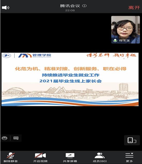 为应对后疫情时期的就业新形势,加强学院与毕业生家长的沟通交流,提升同学们的就业积极性和就业能力,管理学院于11月18日起,分时段、分场次共组织了7场2021届毕业生线上家长会。学院党委副书记程玉莲、张强老师、部分专业专任教师、全体毕业班辅导员以及毕业生家长参加了会议。各场会议由各专业辅导员主持。对于部分无法出席本次会议的学生家长,各毕业班辅导员后续通过电话、短信、微信、邮件等形式与家长进行沟通,做到了1140名毕业生家长信息传达全覆盖。