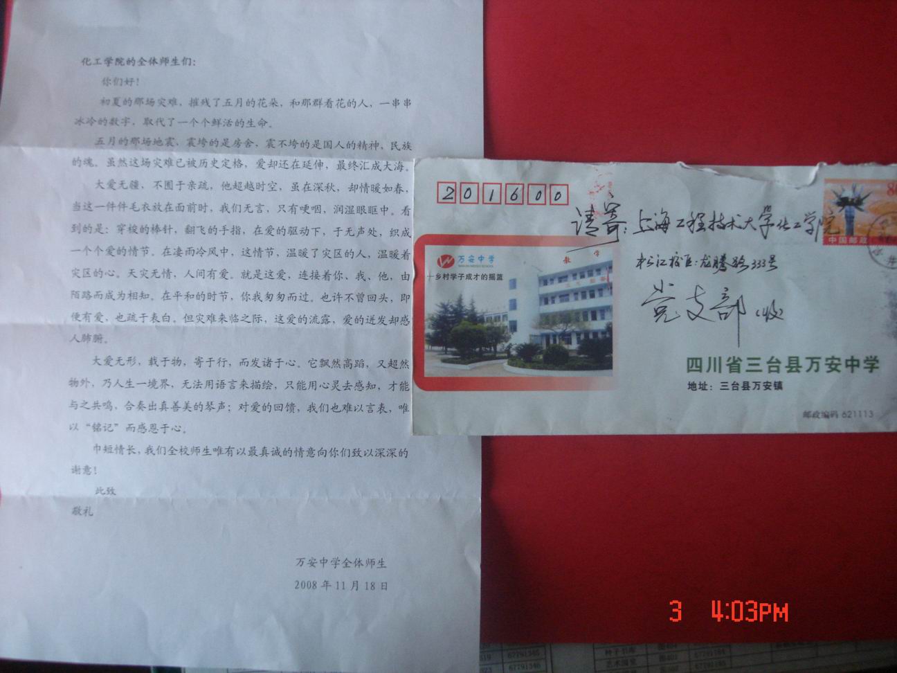 日前,四川省绵阳市三台县万安中学党支部给化学化工学院全体教职工发来了热情洋溢的感谢信,对学院女老师和部分女同学编织的“爱心毛衣”、“爱心围巾”表示深深的感谢。