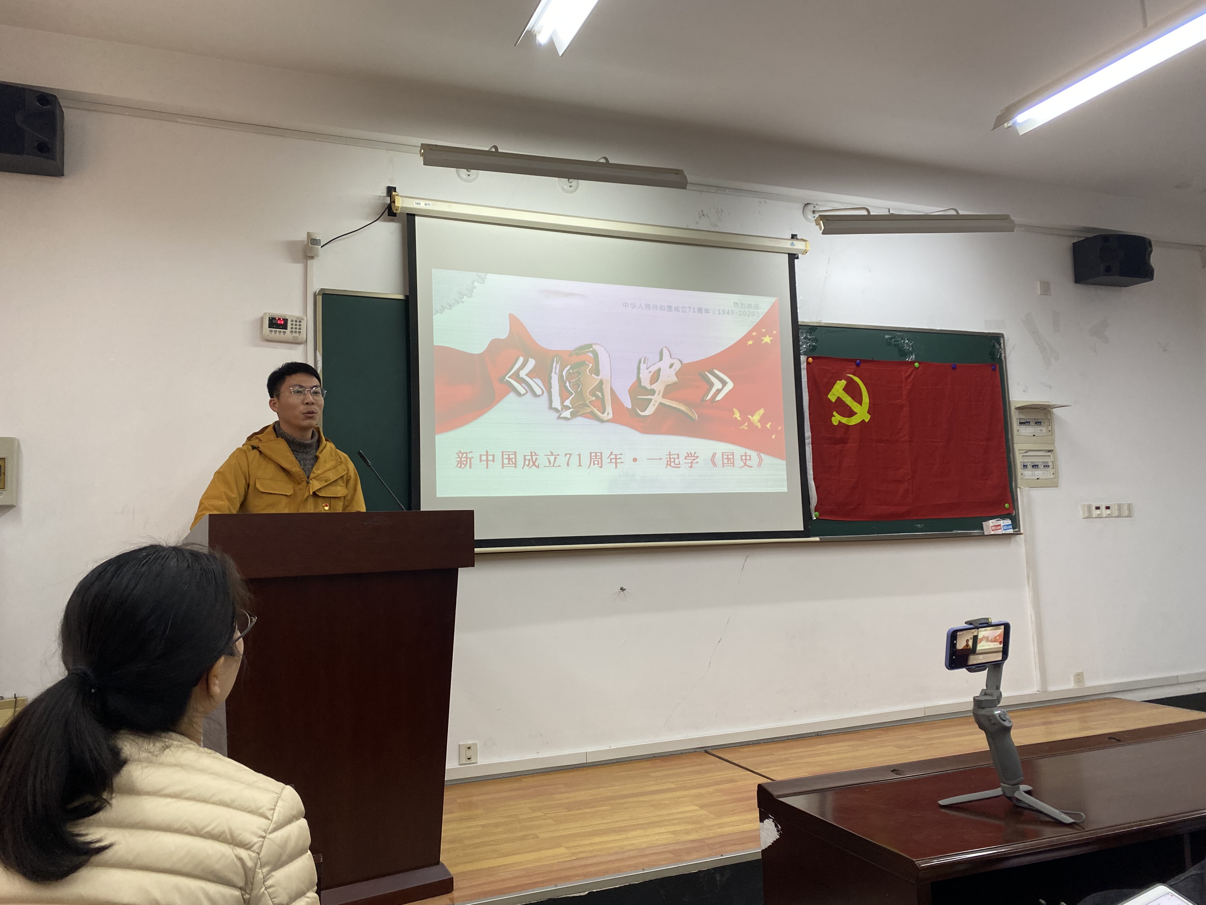学生第二党支部周曦、研究生第一党支部徐伟、研究生第二党支部王伟、研究生第三党支部李玮婷和中法学生党支部陈易如参加了本次讲演擂台赛,他们信心满满,分别就自己准备好的党史做了生动讲解,赢来了大家的一致好评。尤其是周曦同学关于《新中国成立71周年·一起学国史》的讲解期间不断和同学们进行互动,整个演讲过程非常精彩。