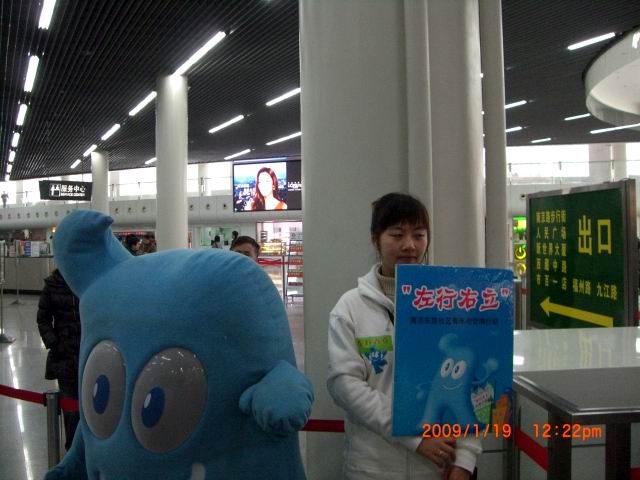 只见“堵”在下行电梯两头的四名志愿者手持扩音器,面对“违规”的乘客,他们耐心地一一提醒。很多的乘客都非常自觉地遵守“左行右立”,有些乘客在志愿者的引导下能马上配合,但是有些乘客还是依旧我行我素,视而不见,在相对人流量大的下行自动扶梯上造成了拥挤的现象。尤其现在是“春运”高峰时期,很多提着行李的乘客把电梯宽度全部占用,也为志愿者们提出了不小的挑战。但是大家也欣喜地看到,很多小朋友在由一位志愿者扮演的充气“海宝”的指引下,正确的遵守“左行右立”,也为很多成年人做出了榜样。 | |