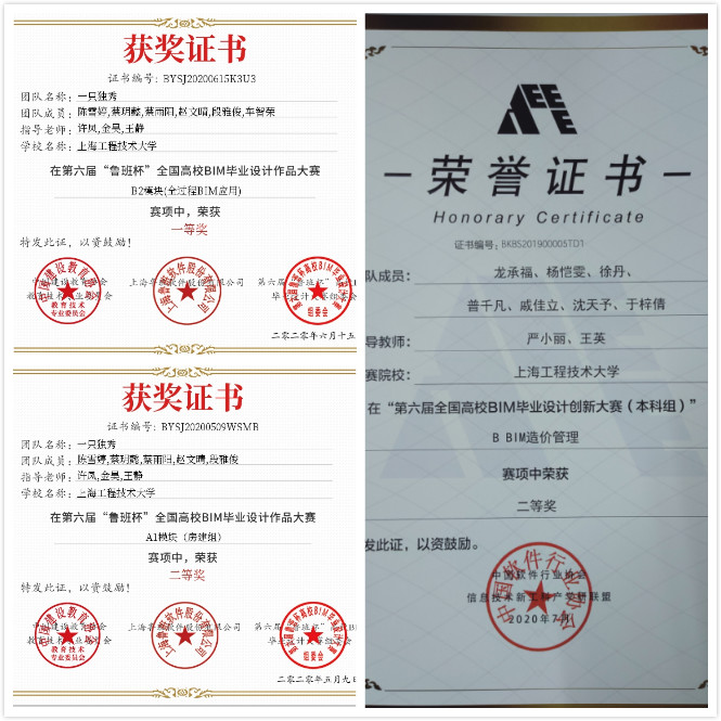 至此,2020年度工程管理专业指导学生参与国家级大赛落下帷幕,取得了一系列成绩。其中,由许凤、金昊、王静等老师指导的“一枝独秀”团队在第六届“鲁班杯”全国高校BIM毕业设计作品大赛(500支参赛队伍)B2模块荣获全国一等奖,A1模块荣获全国二等奖;由严小丽、王英、刘国斌等老师指导的团队在第六届全国高校BIM毕业设计创新大赛中(457所高校,1063支参赛队伍)荣获全国二等奖和优秀奖。