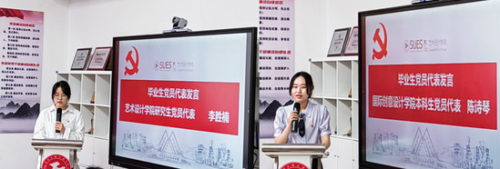 艺术设计学院研究生党员代表李胜楠讲述了青年党员的责任与担当,表示要用自己的实际行动践行党员的初心和使命。国际创意设计学院本科生党员代表陈诗琴表示,要时刻铭记党员的身份与责任,为党旗添彩,为党徽增光。