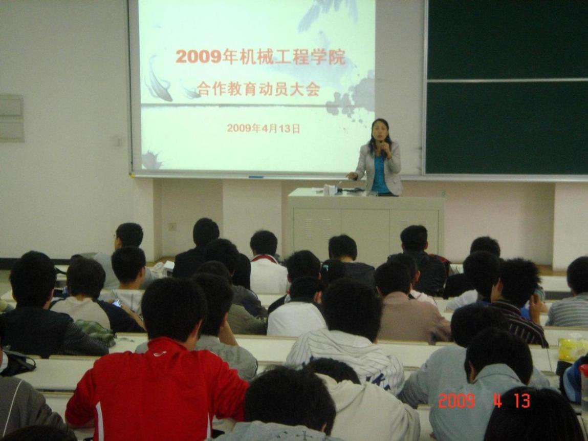 虞蓉老师首先向大家详细介绍了合作教育的定义、性质、历史以及我校开展合作教育的基本情况。她指出,2009年机械工程学院将有597名同学参加合作教育,总人数与2008年基本持平,但是受到国际金融危机的影响,今年合作教育的安置工作将具有很大的挑战。她希望在学院合作教育领导小组的领导下,全体师生能够紧密配合,顺利地完成今年合作教育的各项任务,为学校合作教育的发展做出自己的贡献。随后,赵晔煚老师就机械工程学院2009年合作教育特殊点、学生安置、协调员配备等情况做了介绍,并详细演示了学校学生工作管理系统。会议在全体同学热烈的掌声中顺利结束。 | |