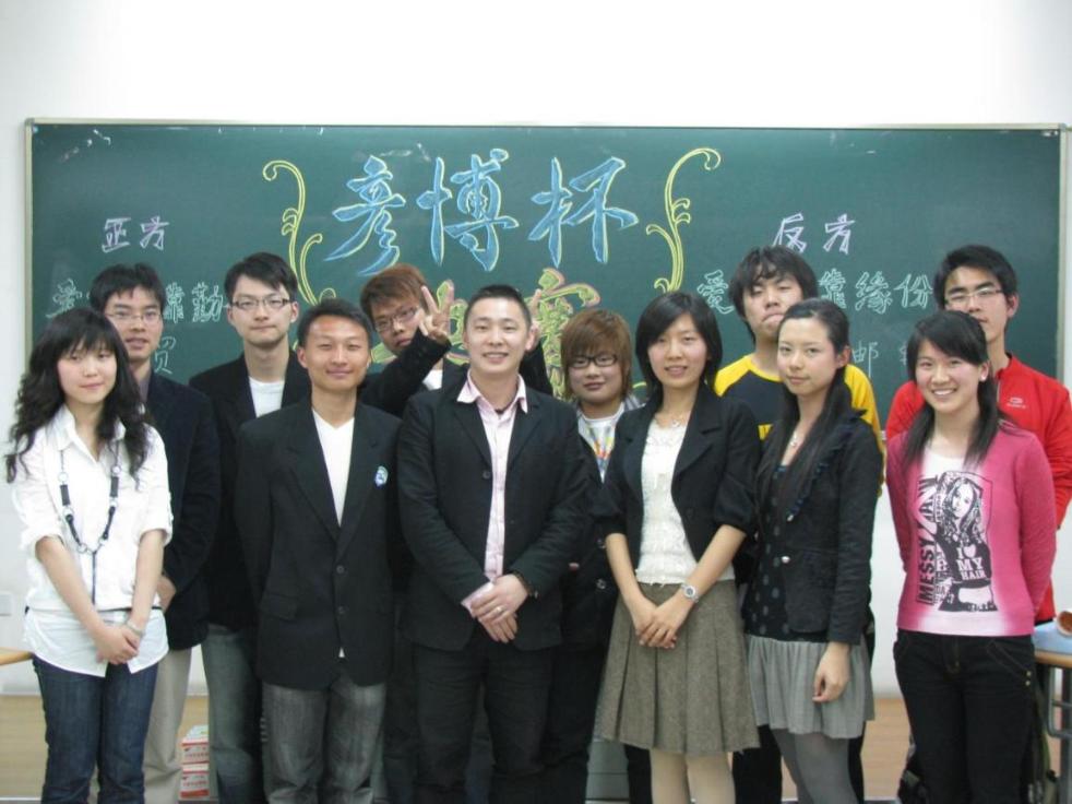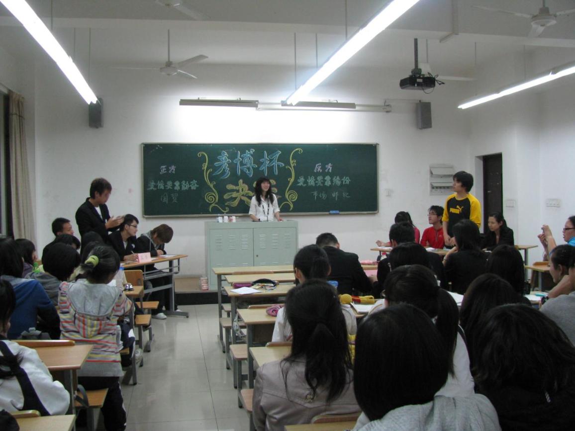 4月29日19时30分,期待已久的首届管理学院“彦博杯”辩论赛总决赛在E411教室拉开帷幕。本场比赛的评委为管理学院分团委书记周家樑老师、辅导员张可菡和梁发明老师。 这次辩论赛是历时近一个半月,经过一系列的初赛,复赛。而在这多场比赛中脱颖而出的08届国际贸易班和08届市场营销的油轮经济班分别作为本场辩论赛的正方和反方。正方观点为:爱情要靠勤奋;反方观点为:爱情要缘分。 相对于之前较严肃的辩题,这个辩题显得轻松而且贴近生活。正方的观点是“爱情要靠勤奋”,他们坚信爱情是一个实际的过程,要靠实际的勤奋使之成为可能。反方的观点是“爱情要靠缘分”,他们相信有了缘分才会有爱情的开始。最终由正方国际经济与贸易的同学赢得了比赛。这个胜利来之不易,从复活赛至今,他们付出了相当大的努力,一路披荆斩棘,终于夺得了桂冠。而市场营销·邮轮经济尽管惜败,但他们独到的见解,和犀利的言辞,都可圈可点,给观众和评委留下了深刻的印象。评委梁发明老师的点评也是句句在理,一针见血,阐述了自己对爱情的理解。而观众们对本场比赛也是好评连连,诗意的开篇综述,针锋相对的攻辩,激烈的自由辩论以及精彩的总结陈词,使得本场比赛不失为一场精彩绝伦的决赛。本场比赛的最佳辩手为来自市场营销的吴佳妮同学。 本届辩论赛开赛以来,多元化的辩题涉及了环保、教育、网络以及感情等等社会热点问题。辩论赛是大学校园中不可或缺的活动,不仅丰富了同学们的课余生活,使同学们得到了锻炼,加强了自身的辨证思维,而且增强了同学间的凝聚力,营造了浓厚的学术思辩氛围,彰显了当代大学生崇尚知识、关注社会的个性,展现了年轻一代的团结、自信、青春和活力。