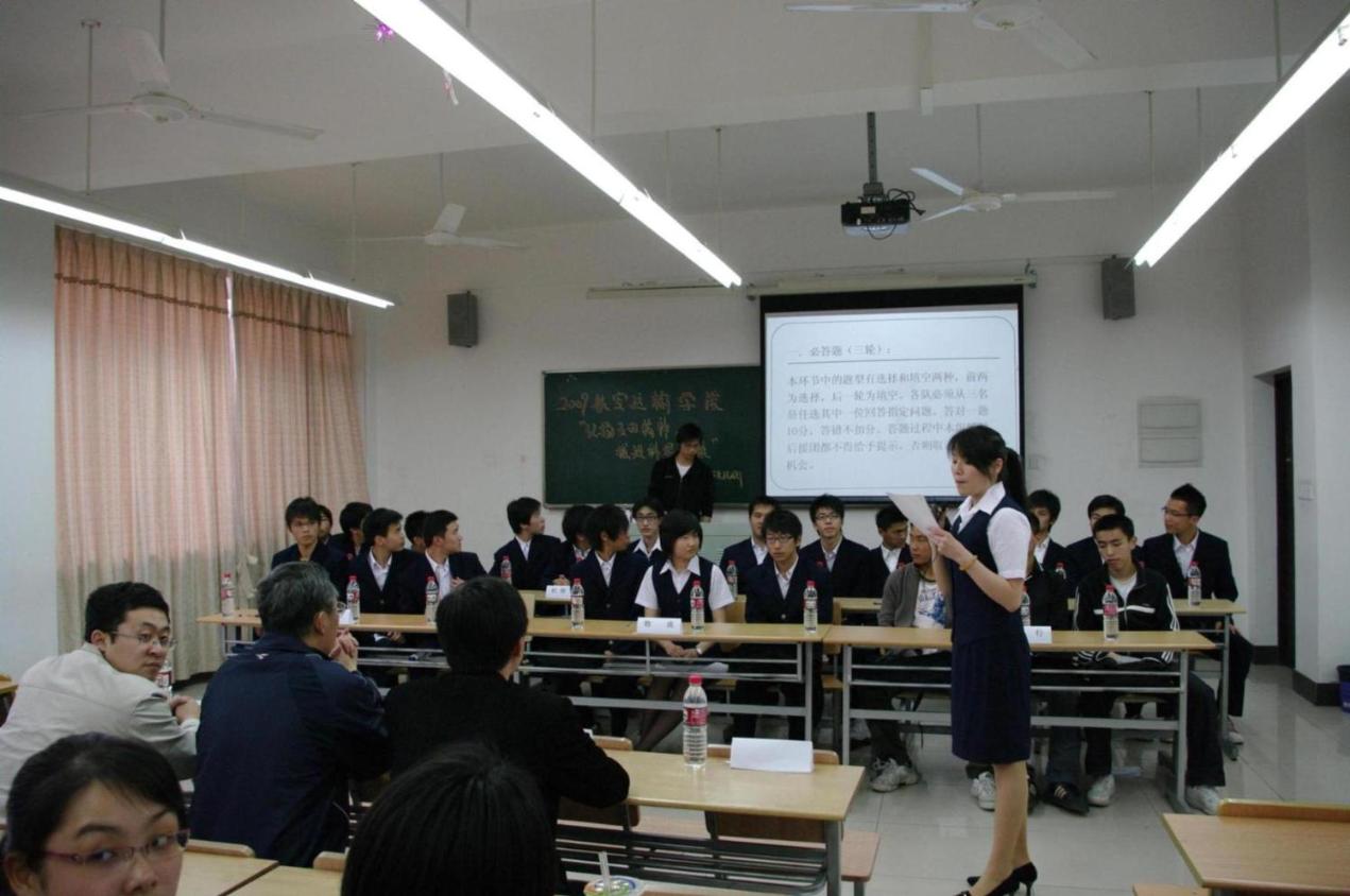2009年4月28日,航空运输学院理论部在教学楼E411举办了 “五四运动”知识竞赛,由航空运输学院08级7个班级参加。 本次比赛由学院的路新生书记,陈鑫老师和姜孟升老师担任评委。比赛共分三个环节,两轮必答题和一轮抢答题,在抢答题中加入了扣分环节。比赛中,每支代表队都发挥出自己的全部实力,整个会场气氛跌宕起伏、高潮迭起,掌声一阵接着一阵。最后,航空机务一班以他们的充分准备和良好发挥得到了冠军。 这次竞赛旨在发扬“五四”精神,让每位同学不忘那段90年前的血雨腥风,争做一个优秀的先进青年。 稿件作者:丁易弓责任编辑:陈文琼