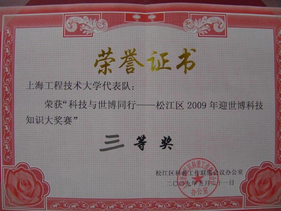 本次大奖赛由松江区科普工作联席会议办公室、松江区公民科学素质工作领导小组办公室主办,松江区永丰街道承办。汽车工程学院代表队通过学习宣传世博会及有关科技知识,研究《科技知识试题汇编》并经过迎世博科技知识初赛,最终进入到此次决赛当中。 伴随着观众的欢呼声,比赛拉开了帷幕。决赛共分为四个环节:必答题、论述题、抢答题和风险题,由主持人为选手们选择本次的参赛题目,经过四轮角逐,得分最多的代表队将获得本次比赛的冠军。比赛的题目各有特色,内容包括有趣的世博会相关背景,复杂多变的社会环境,丰富多彩的科学技术等。在必答题和论述题的环节中,汽车工程学院的同学们表现出色,均以满分通过选手们出色的表现引来台下掌声不断,欢呼不绝。比赛现场穿插的观众知识问答,也带动了现场的气氛。之后的抢答环节更是展现了选手们的应变能力和聪明智慧。随后激烈紧张的风险题更是将比赛推向了高潮,选手们斗智斗勇,用精彩的表演赢得了观众的掌声。最终汽车工程学院代表队获得三等奖,一等奖由岳阳街道代表队获得。