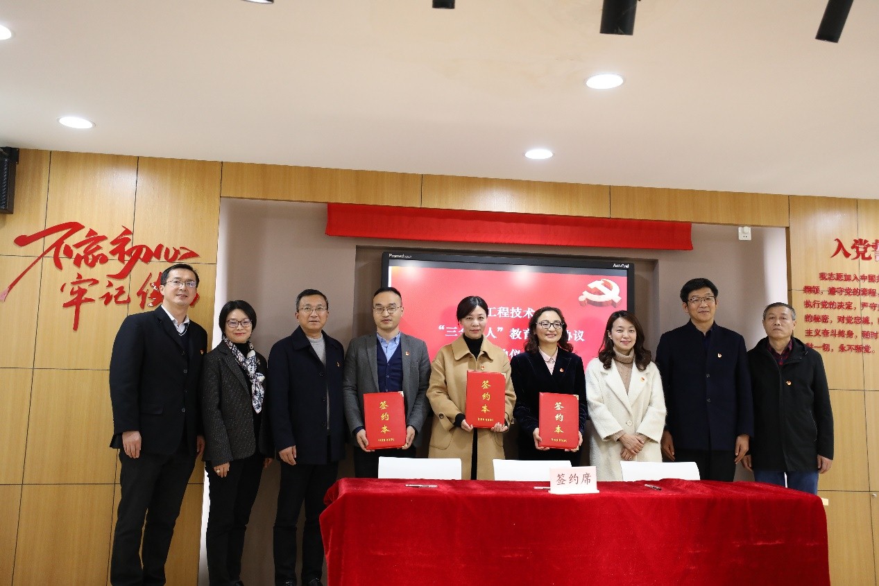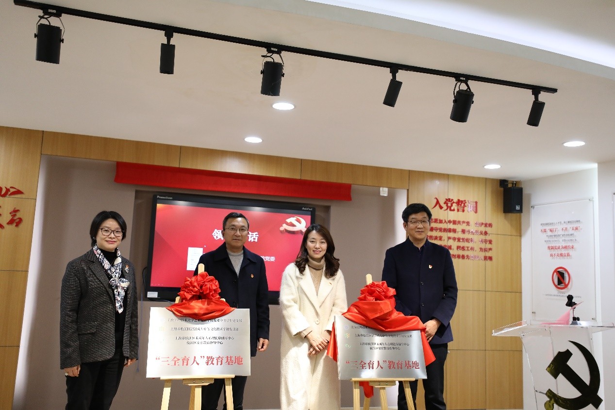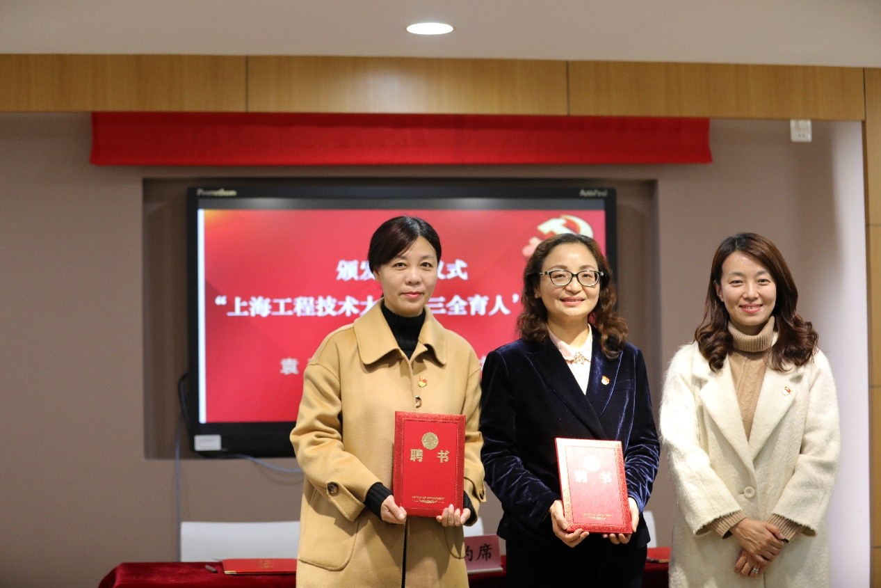 袁蓉书记向洞泾成人中等文化技术学校党支部书记沈强妹颁发“上海工程技术大学‘党员导师计划’党员导师”聘书,向松江区未成年人心理健康辅导中心、松江区家庭教育指导中心主任张贞颁发“上海工程技术大学‘三全育人’导师”聘书。