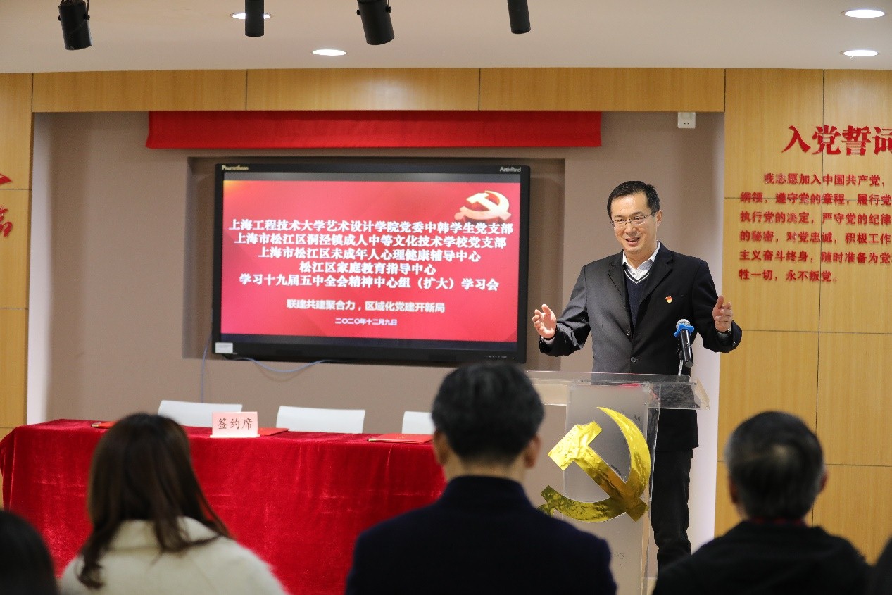 12月9日,艺术设计学院党委中韩学生党支部与松江区洞泾镇成人中等文化技术学校党支部、松江区未成年人心理健康辅导中心、松江区家庭教育指导中心“三全育人”实践教育基地签约授牌仪式在洞泾镇党建服务中心隆重召开。松江区洞泾镇副镇长张燕;松江区教育局副局长冯雷、付炳建;松江区洞泾成人中等文化技术学校党支部书记沈强妹,松江区未成年人心理健康辅导中心、松江区家庭教育指导中心主任张贞;艺术设计学院党委书记袁蓉、副书记马建立,中韩学生党支部书记李志海,中韩多媒体设计学院党政办主任苌欣,各单位相关科室负责人以及学生党员代表参加了揭牌仪式,仪式由艺术设计学院党委副书记马建立主持。