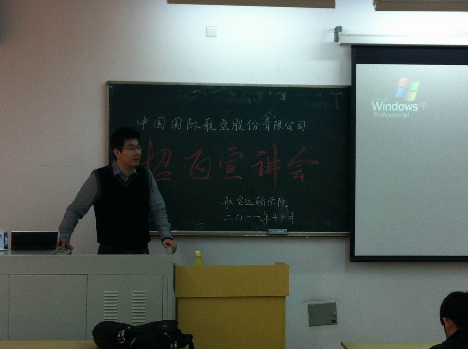 |  11月25日下午,国航招飞宣讲会在我校教学楼E110教室举行。 中国国际航空股份有限公司简称“国航”,其前身是中国国际航空公司,成立于1988年,目前是中国航空集团控股的航空运输主业公司,是中国唯一载国旗飞行的航空公司、星空联盟成员、北京2008年奥运会合作伙伴。在航空客运、货运及相关服务方面,均处于国内领先地位。 从本次宣讲会了解到,国航招收的对象为大三学生和大四应届毕业生,男性,还应符合国航的各项招聘条件,例如身高须在170厘米—185厘米,大学英语四级425分以上,裸眼视力不低于0.3(C字表)等。 航空运输学院符合条件且热爱飞行事业的同学积极参与了此次宣讲会,不少同学表示会积极争取这次加入国航的机会圆自己的飞行员之梦,希望他们能以良好的精神面貌迎接日后的体检和面试。 |