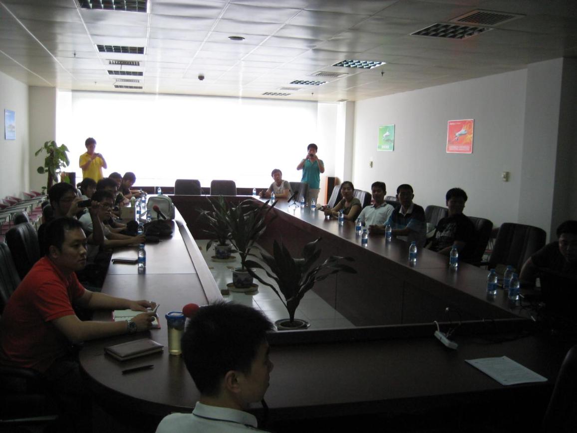 下午一点,代表队来到了上海航空公司浦东基地,上航团委书记戚自钢及有关部门领导与代表队成员召开了一次小型座谈会,由上航领导向大家介绍了上航目前的运营状况,公司的部门职责和应对世博会的有关方案,并向大家展示了在经济危机之下公司所做的一些努力和取得的成果。随后代表队同学们针对上航对于世博会的计划和近期上航东航合并的问题进行了提问,对此上航领导们做了详细的解答。
