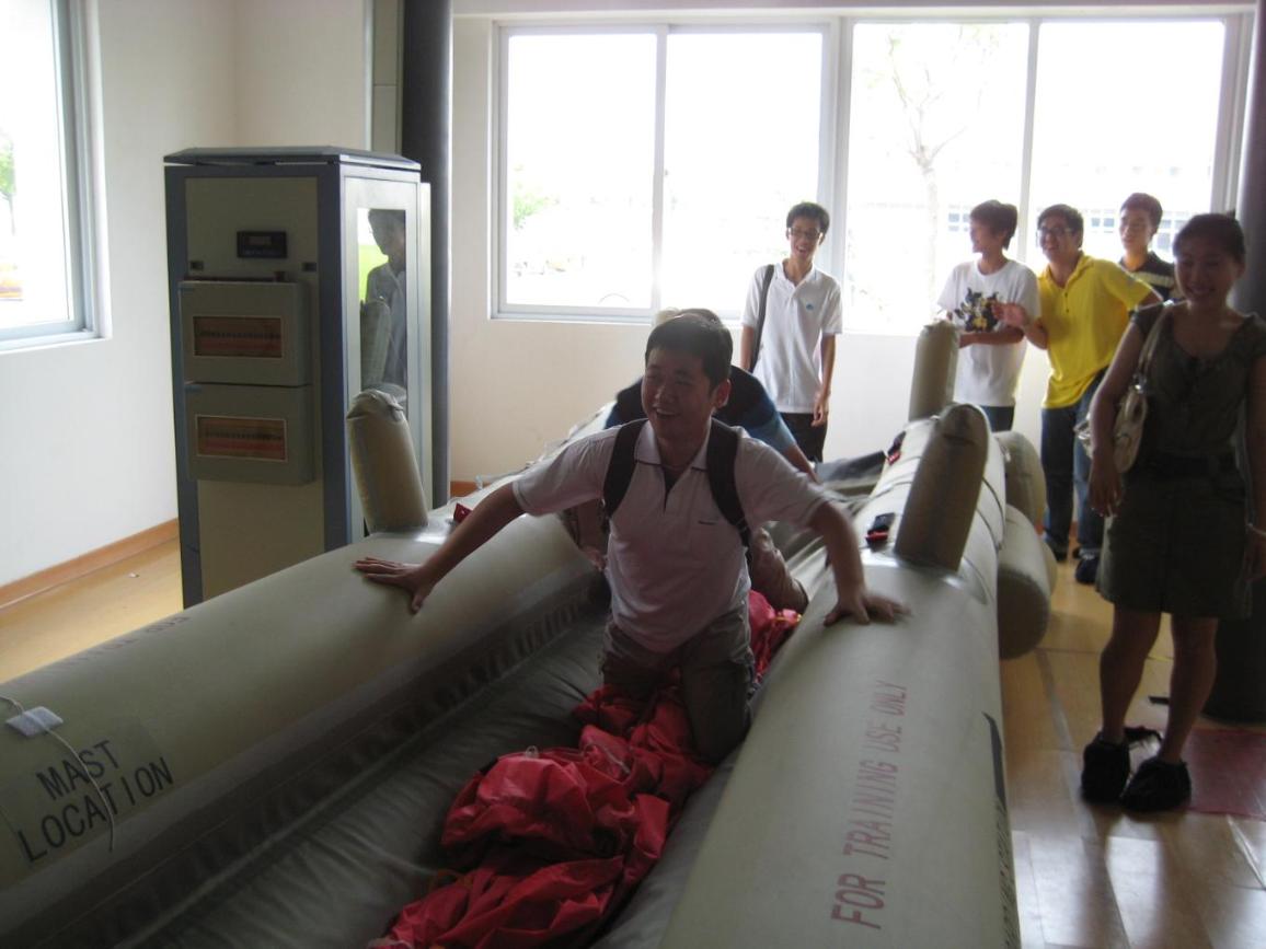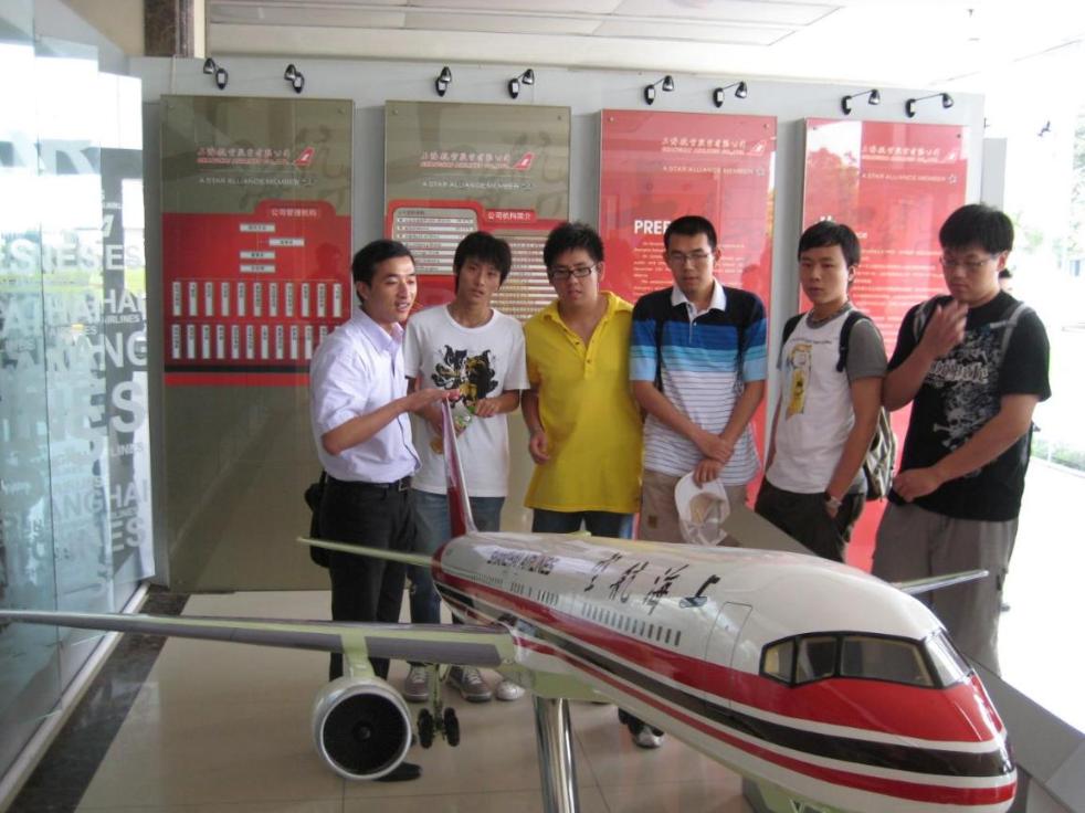 座谈后,为了亲眼目睹上航应对世博会的努力成果,代表队一行人在上航有关人员带领下参观了上航客运部紧急情况培训室,其中对于各种紧急情况的总结归类和解决方案,可谓面面俱到,同学们还亲身体验了上航主要机型波音737、波音757、波音767等客机的逃生门和紧急出口;有些同学还爬上充气逃生船,体验了一把平时体验不到的感觉。最后,代表队参观了上航历史陈列馆,馆中记录了上航从1985年成立至今的点点滴滴,记录了上航从一个只有几架飞机的小公司发展到加入“星空联盟”的拥有近70架飞机,几十条国际航线的大型企业的过程,队员门无不被这种进取的精神所感动。