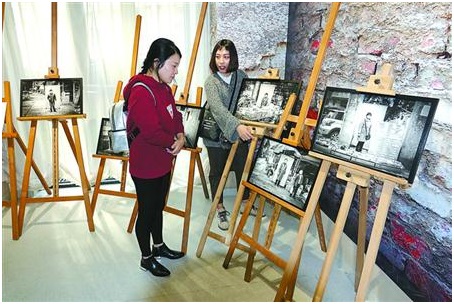 高雨(右)向观众介绍她拍摄的松江老街上的人物。蒋迪雯摄