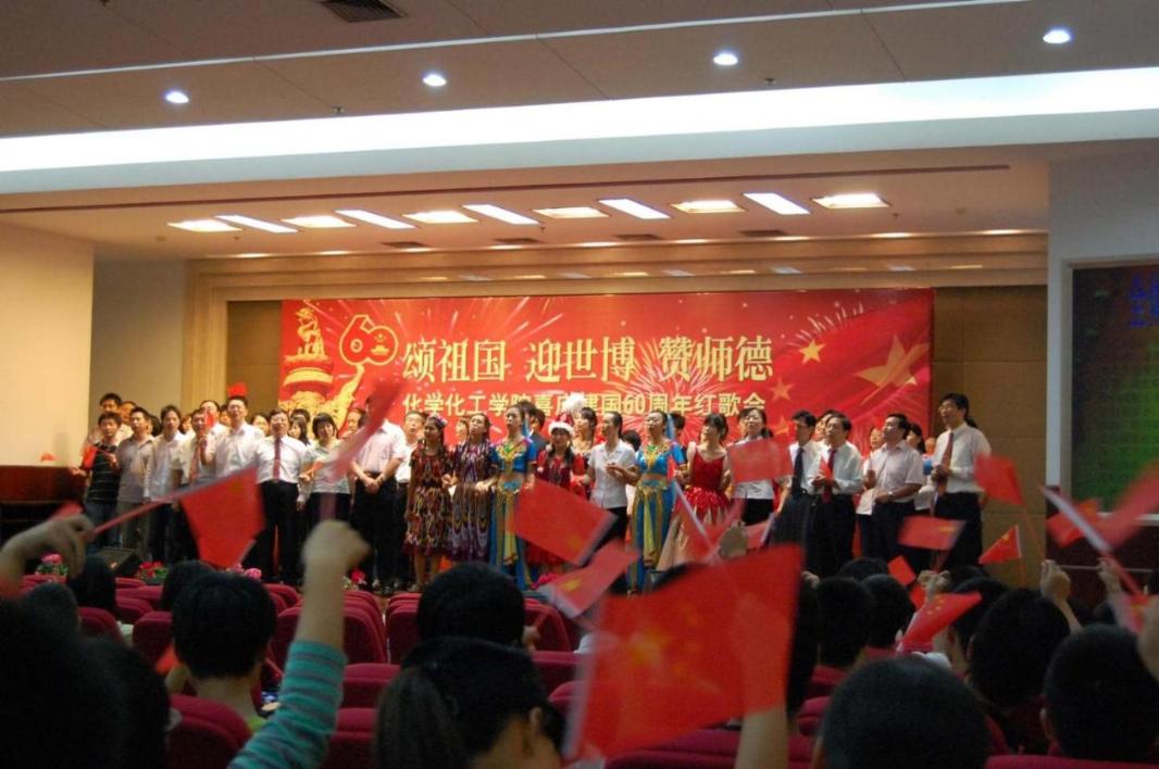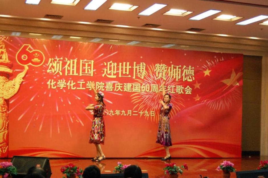 教授老同志合唱的《今天是你的生日》浑厚深情;青年教师合唱的《没有共产党就没有新中国》激情洋溢;一支《神奇》舞蹈带来了异域风情;一曲《化工欢迎你》引来了台下阵阵掌声!师生拉歌、配乐朗诵、乐器独奏等连番登场,这次还有几位少数民族的同学参与到了这次的红歌会中,她们用优美的维吾尔族和柯尔克孜族舞蹈吸引着观众的眼球,表示身为化工人的喜悦与自豪,化学化工学院民族团结,其乐融融。 最后全场大合唱《歌唱祖国》歌声嘹亮,化学化工学院红歌会也在这高涨的气氛中完美落幕。师生同乐,在一片歌舞声中,唱响了对祖国60华诞的衷心祝福;对上海2010年世博会的美好祝愿;对教师百年树人奉献的深切感恩! 化学化工的师生们用自己的心声祝愿祖国的明天更加辉煌;愿化工师生们的未来更加光明!