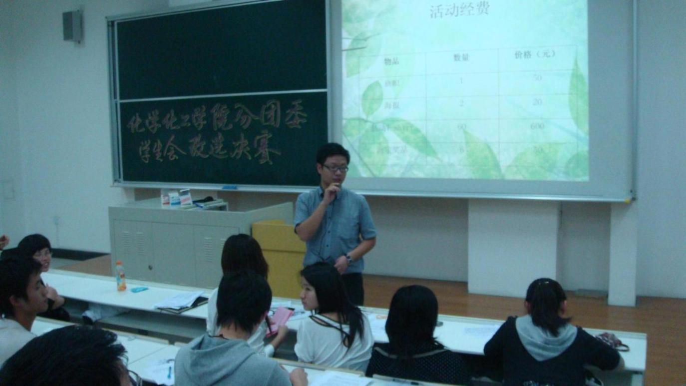 |  10月19日17:20,化学化工学院于E517举行了2009年度分团委学生会换届选举总决赛。此次有22名分团委学生会干部进入决赛,角逐14个最终名额。分团委书记王佳杰老师以及13位学生会干部组成评委团,同时各班代表和参赛者后援团也将为竞争者投上庄严的一票。  本次换届选举竞争激烈且要求严格,22名选手从海选走到初赛,从初赛进入复赛,最终闯入决赛,经过层层的筛选,他们凭借自己优异的表现、激发彼此的潜力让大家留下了深刻的影响,同时也了解到他们的能力。 总决赛以团队合作模式进行参选,为保证公平公正原则,15日中午以抽签方式随机配对组成6个小组并以化学元素周期表主族元素命名,同时随机抽取参赛题目。赛上,6组成员用自己的才华和智慧围绕参赛题目尽显自己的创意和想法,有条有理地絮说各组的活动策划方案,同时以PPT的形式展现了各组团队合作的结晶。在评委问答环节,赛事尤为激烈,参赛者的回答与评委们的意见都给与彼此一定的启发,选手们敏捷的思维和干练的言语也引起了大家的赞赏,谁取谁弃让大家难以决断。2个小时的角逐,让每个人都紧张不已,但是选手们毫不怯场,他们在比赛中挥洒激情,洋溢才能,展现自我。最终经过评委团,班级代表和后援团的票选,决断出最终的入选名单。 换届选举已经结束,通过激烈竞争的14名新干部即将投入到各自新的工作中,落选的选手也不气馁,相信在他们团结协作下,化学化工学院分团委学生会有新的气象,新的活力,新的高度! 分团委学生会 |