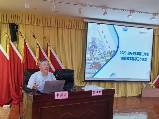 教育教学督导专家组组长鲁嘉华通报了本学期督导工作情况,用详实的数据对校督导工作质量进行了分析。鲁嘉华教授对下学期督导工作提出了三点希望:一是常规工作提质增效,提升督导评价的客观性与公正性,加强与授课教师的互动交流;二是专项工作走深走实,教育教学督导组将进一步服务学校高质量发展,不断拓展督导业务;三是希望督导加强学习,与时俱进,不断提升履职能力。