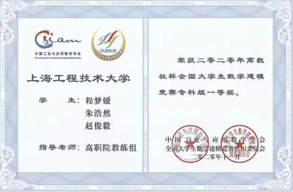 近日,从全国大学生数学建模竞赛组织委员会传来喜讯,在9月10日至13日举行的2020高教社杯全国大学生数学建模竞赛中,高职学院程梦媛、朱浩然、赵俊毅三位同学夺得专科组全国一等奖暨上海市一等奖,朱欣妍、王文杰、丁乐三位同学夺得专科组上海市三等奖。