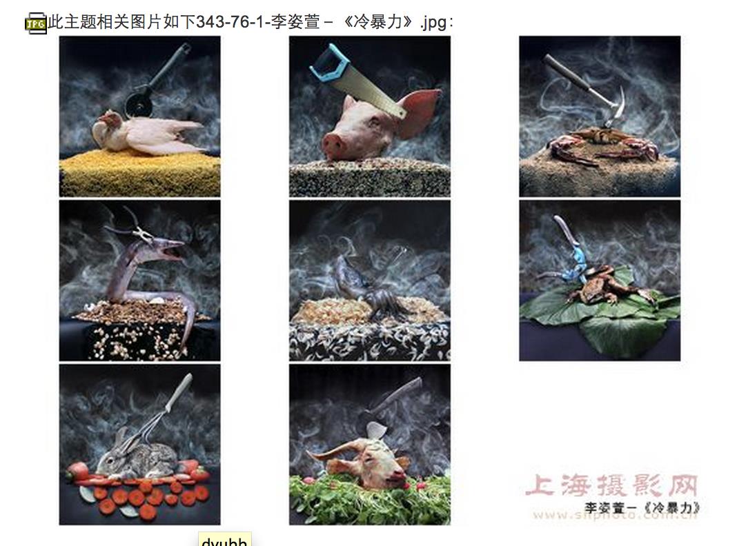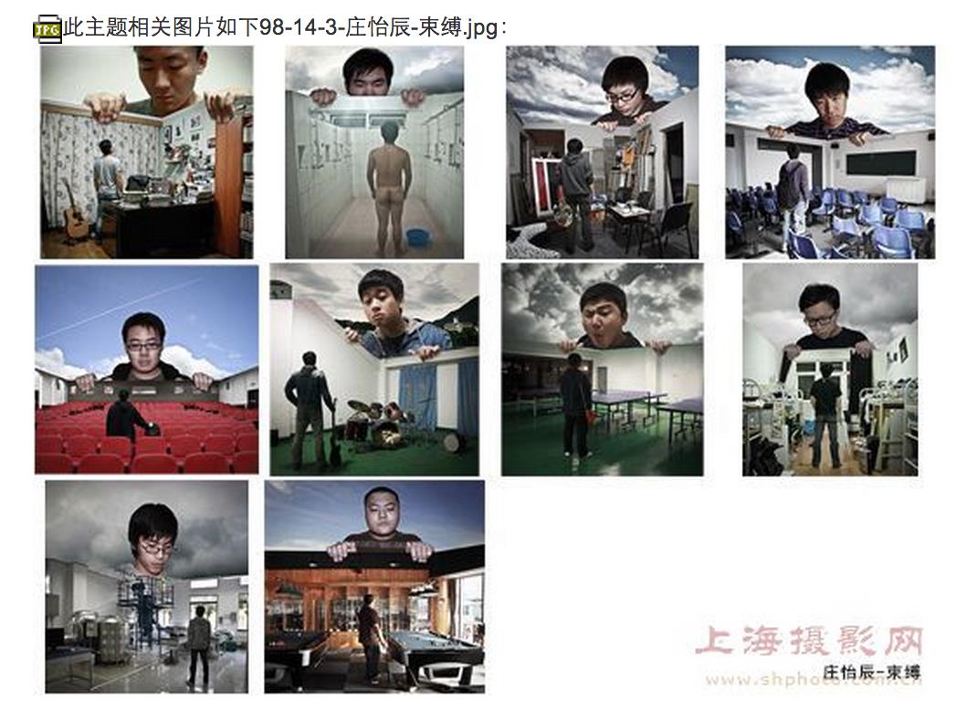 | 最佳作品: 颜小聪 《the elderly and me(老者与我)》指导教师:王如仪 作品以一种幽默的、独特的视觉拍摄方式,展现了老人们生活的丰富多彩,欢乐的晚年。告诉人们要敬老、爱老,构建和解社会。  最佳作品提名: 李姿萱 《冷暴力》 指导教师:金鹤 作品《冷暴力》是想表达出当今社会人们对食物尤其是荤食的过度浪费和残忍对待。在拍摄过程中,选择不同的背景来搭配不同的食物主题,并挑选视觉冲击力最强的工具,将三者搭配在一起进行拍摄希望借此唤醒人们对食物神态链的保护和尊重。  夏阳刘 《夜汇美》 指导教师:沈洁 当夜幕降临之时,我穿行在城市之间,原本那些白天在城市的角落里的事物也散发出了优雅迷乱的气质。我开始发掘他们的美,善良地看待它们,而不是冷眼旁观。这组作品的所有颜色均是前期靠闪光灯加滤色片在营造出来的。后期只进行了简单的修饰。 庄怡辰 《束缚》 指导教师:王如仪 画面通过空间和空间的关系作为影像构成的形式。 人往往将自己束缚在一个空间。工作,学习上的亮点一线,宅男宅女甚至不愿意走出家门,其实于外界无关关键在于自己潜意识的将自己束缚在一个空间范围里  周宇楠 《冰壳》 指导教师:王如仪 这组作品的主要元素是冰块和女子的身体。通过分割、拼贴、重组人体,加入主观的象征符号,表现主观个性抽象的艺术色彩。冰块在作品中具有象征意义, 就好像是衣服、是遮挡物,是含蓄的而带有主观色彩的表现。它有固态和液态两种形态,当它是固态的时候,是有造型有个性的;当它是液态的时候,便融化成了水,是柔软的,好比女人是水做的,坚强的外表下有一个柔软的心。  评委推荐佳作: 赵桑桑 《逆》 指导教师:王如仪 在热闹的大学城,以自拍的形式,拍摄了一组不在乎他人眼光的照片,做真正的自己。  入选作品: 顾隽逸 《戏曲人生》 指导教师:金鹤 作品表达了每个人生活在自己的空间当中,并非所有人都是主观愿意进入这样的一个自己并不是特别喜欢的场景中,扮演着自己未尝喜爱的角色。而我所表达的,旨在利用戏曲的化妆形式展现出现代社会人在内心的异样,夸张的情绪表现出来。或者是展示出他们自己原原本本的一面。  王丹青 《瘾》 指导教师:沈洁 瘾,有对某样事物成谜或依赖的含义。作品中,模特被装扮成各种造型,通过肢体语言与道具的结合,表现出了对于不同事物的“瘾”。  谢天 《最盛期后的光景》 位于日本长崎县的池岛。1959年开始开矿作业,当时岛上人口达到7000余人。但在2001年当地关闭了开采作业,岛上的人们开始离开这座岛,现在岛上只剩下了大约200人。 环岛走上一圈,基本遇不到当地居民,周围都是废弃的公寓与当时的工厂。跨过挂有“禁止进入”牌子的警告线,当时辉煌的场景依稀可以感觉到。闭山12年来,现在约200人口中的年轻人是否还愿意待在岛上,岛上的建筑是否就这样保存下来,带着各种思考,将池岛的现状通过影像传达出来。  庄怡辰 《Big Blue》 投身于蔚蓝的大海,彻底将社会人的身份抛开只是单纯的作为地球上的生物融入海洋与海洋生物一同游弋,感受这大蓝水带来的那份感动。 拍摄地:菲律宾 墨宝  王伟康 《双流茶馆》 指导教师:王如仪 成都双流“观音阁”,一个自抗日战争时期就保存至今的茶铺。在这样一个破旧的环境下,依然能看见每位茶客脸上的笑容,那已不仅仅是一种创作,是一位年轻人用摄影去体会不一样的生活方式。  石浩群 《残留的影像》 指导教师:王如仪 在如今这个都市中,随处可见的高楼大厦,拥挤、繁忙、快节奏的生活方式已然成为了一种习惯。人们都渐渐地远离了城市的边缘地带,那些寂静、悠远的地方都被大家遗忘了。我想让大家重新关注身边的被遗弃的一些角落,重新发现一些被遗弃的美。 运用黑白摄影的手法,用最简单的方法表现一种被人一起的物品的状态。我们品是都不太关注一些被遗弃的东西,我选择用相机记录下来,重新让人关注身边的点点滴滴。  佟晓薇 《金婚》 指导教师:王如仪 看到如今的年轻人离婚率那么高,再看看老一辈人虽然经历风雨却还是依然相守相依,想起曾经看过一部电视剧叫《金婚风雨情》,因此我想到拍摄以金婚为主题的一组照片。  朱达超 《一秒的视线》 指导教师:王如仪 以具有时代性的上海为拍摄主题,以1秒这个时间的概念,用多张照片合成表现方法来反映不断变化的街道,把它们独特的速度感凝聚在了1秒钟以内,想表现出一种捕捉时间的感觉。1秒钟,其实存在无限的信息量。停靠的汽车迎来匆匆赶到的乘客,即将驶离。行人们奔走于喧嚣的城市,好似一出精心勾勒的短剧。城市中,人群、车辆过往不息,甚至连光影都不做停留。  |
