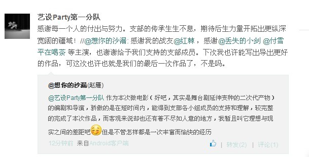 |  9月26日晚,艺术设计学院学生第一党支部在教学楼F210举办“致我们终将到来的中国梦”自制红色微电影成果展示会,获得极大反响,引发线上线下热烈讨论。 党支部首先播放了自制红色微电影“致我们终将到来的中国梦”。微电影以分为三部分。第一部分讲述了五四运动,告诉大家,在上个世纪,那时和我们同龄的大学生他们的“梦”;第二部分以我国近代史上开天辟地的大事——共产党的成立开始,标识着中国复兴的开始,“中国梦”在此播种;第三部分是大家一起大声的说出自己的“梦”,只有少年有梦,国才强,大家喊道“我要去当兵”、“我要成为一名设计师,让更多的中国元素走向世界”、“我想当一名老师,去培养更多的人才”……在那一声声的振奋人心的呐喊声中,告诉大家,21世纪是我们的舞台。 此次红色微电影拍摄,重现了当时的红色记忆,让学生党员们共同置身于那个年代,对那个年代有了更直观地体验和感受,加深对党的理解与热爱,怀想过去,理解现在,走向未来。参演者们对这次难得的拍摄经历抒发了各自的心得体会,讲述了影片拍摄背后的故事以及对未来道路的展望。大二的入党积极份子们更是由衷地敬佩支部学生党员们的创造力、艺术才情以及良好风貌,迫不及待想要加入到支部的建设中来。  活动结束后,党支部还将微电影上传到微博和易班上面,收到师生热评。其中,刘俊燕说:“在党课上观看了前辈们表演的视频,深深的感受到自己要学习还有很多,在今后的学习生活中,认真学习党的知识来提高自己党性的修养”;赵雁说:“此次微电影的拍摄,收获不只是体现在成果上,支部,同学们的支持更让我们感动”……至此,此次成果展示会圆满落下帷幕。 |