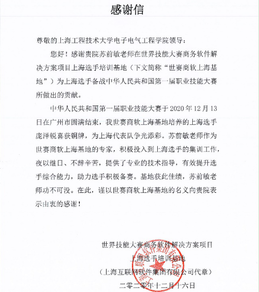 赛前集训阶段,苏前敏副教授多次与学生进行赛前模拟,提供专业的技术支持,并于训练现场指导选手训练。为表彰苏前敏副教授为基地培养选手做的贡献,世界技能大赛商务软件解决方案项目上海选手培训基地发来了感谢信。