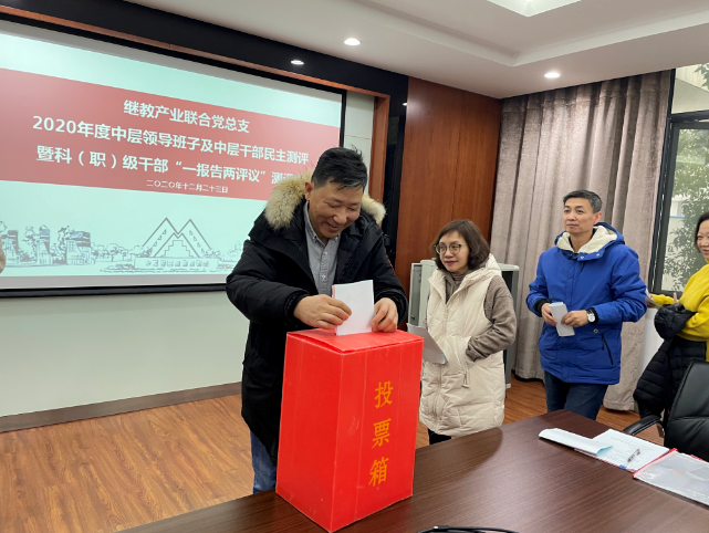 叶枫书记做了2020年度科(职)级干部选拔任用工作报告,对选人用人工作进行了总结和问题分析。继教产业联合党总支副书记、院长谢敏代表继续教育学院领导班子作报告,继教产业联合党总支副书记、产业管理办公室主任施明代表产业管理办公室作报告,分别回顾了两个部门领导班子一年来取得的工作成效,分析了存在的问题和不足,提出了下一步工作思路和努力方向。随后,领导班子成员和科(职)级干部一一进行了个人述职。参会人员认真听取了报告,并根据述职情况进行民主测评投票。