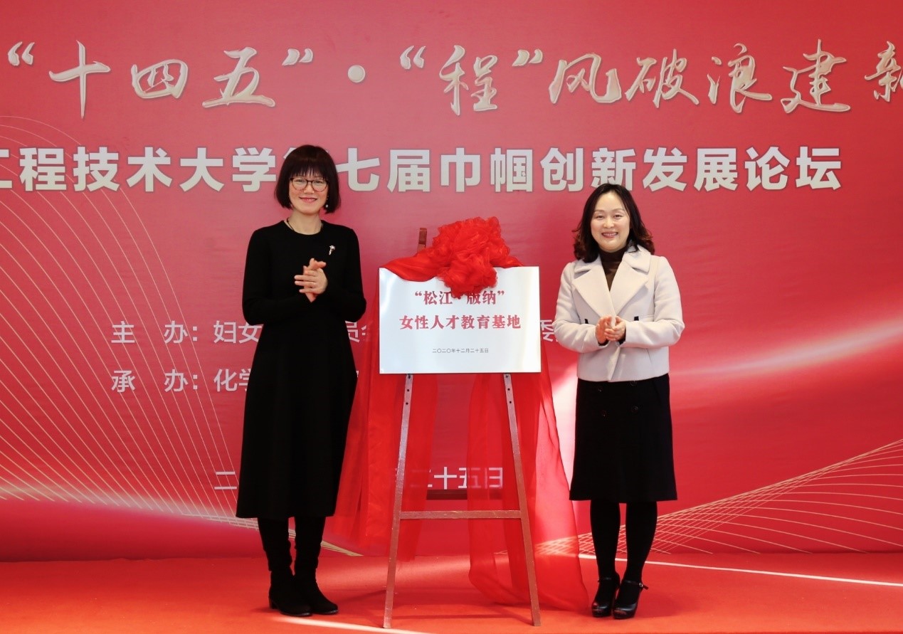 松江区妇联党组书记、主席林华和校妇工委常务副主任、工会副主席、女工委主任李霞共同为“松江·版纳”女性人才教育基地揭牌