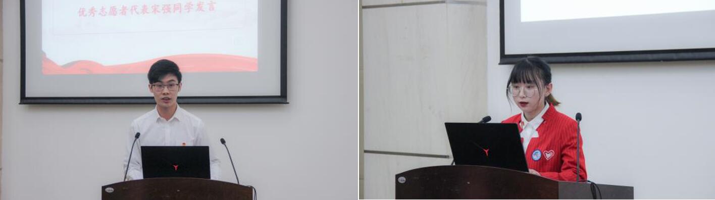 2020年,机械与汽车学子用自己的青春为抗疫助力,学院团委志愿者部通过视频《白熊战士,与爱同行》向他们致敬;迎新志愿者代表宋强同学以及进博会志愿者代表陈俊杰同学交流发言,分享志愿服务工作心得,在他们看来,每一次志愿的付出都是值得的,也是快乐而充实的。