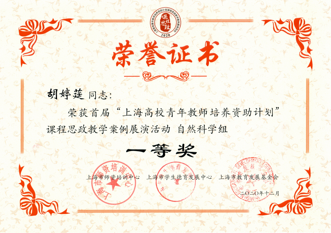 为深入贯彻《高等学校课程思政建设指导纲要》,落实立德树人根本任务,形成全员、全程、全课程育人格局,在中共上海市教育卫生工作委员会、上海市教育委员会指导下,上海市师资培训中心、上海市学生德育发展中心、上海市教育发展基金会于2020年12月11日-12日联合举办首届“上海高校青年教师培养资助计划”课程思政教学案例展演活动。本次展演活动共设有人文社会组、经管法组、自然科学组和高职高专综合组四个组别,由各高校从入选2018年“上海高校青年教师培养资助计划” 的709名教师中遴选推荐59名优秀青年教师参加,通过课程思政教学设计、课堂教学片段、教学反思和现场答辩等方面展示了良好的课程思政建设能力和业务水平。我校化学化工学院胡婷莛老师代表学校参赛,并荣获自然科学组一等奖。