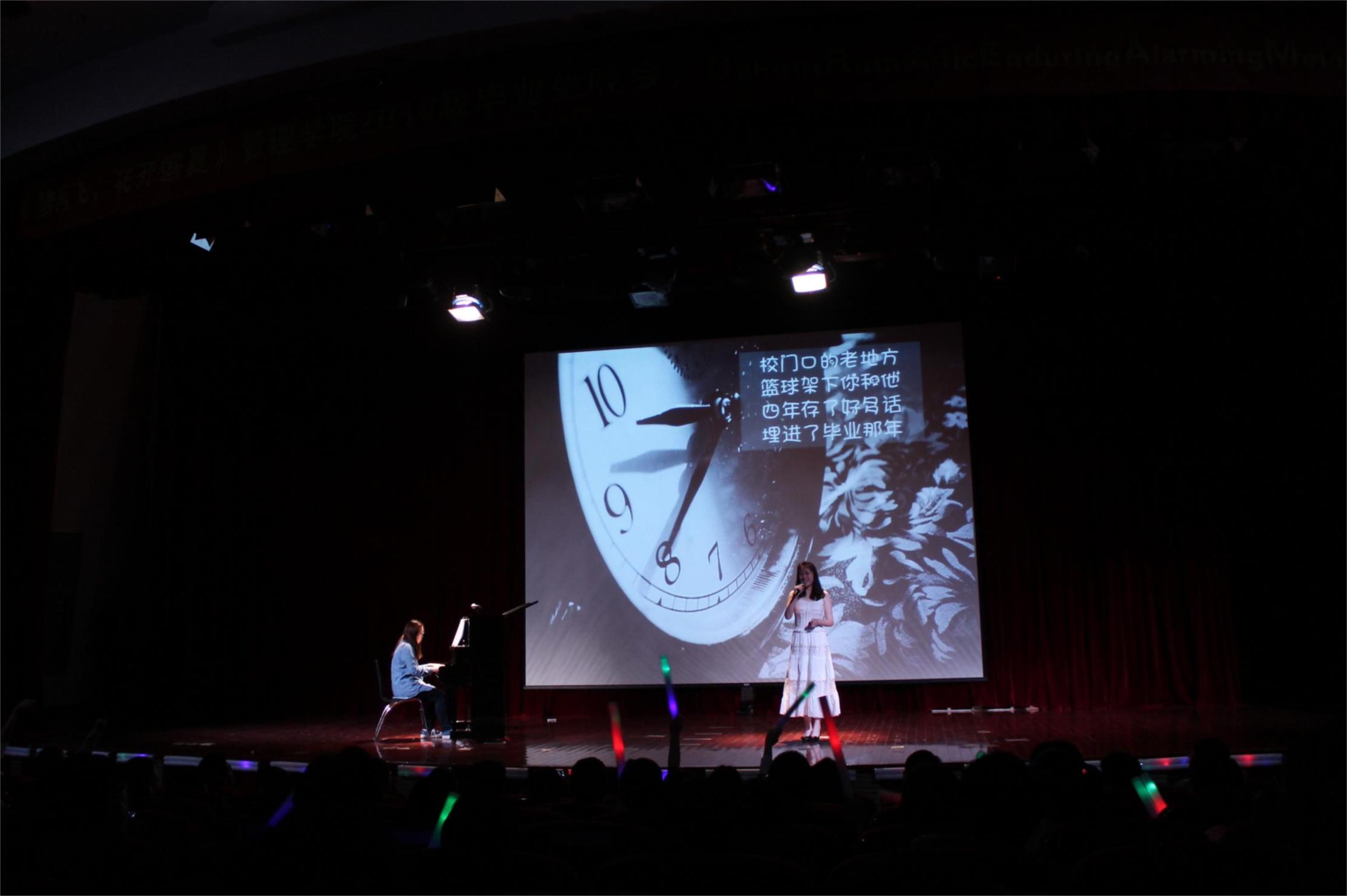 晚会在观众们的期待下正式开始。大四学生5人齐舞和单人独舞的曼妙舞姿展示了毕业生的风采。当将要毕业的学长学姐给学弟学妹们带来情歌对唱“制造浪漫”以及舞蹈团献上的舞蹈《搏了,哭了》时,在场的观众眼眶都湿润了。大学四年曾一起奋斗、一起筑梦、一起哭过、笑过,而今就要离别。可爱的大四学姐《一千零一个愿望》的演唱博得阵阵掌声,落下的尽是不舍的眼泪。接下来,大屏幕播放《老师的话》,老师们的鼓励与祝福更加坚定了他们去打拼美好未来的信念。随后2014年度“校园十大歌手”冠军曹泽亚同学奉上歌曲《时间都去哪儿了》代表学弟学妹们表达了学长学姐们的挂念和祝福,引发了大家对时间匆匆的感慨。最后。031C101班带来了大合唱《再见》,大家在流泪中欢笑,在离别中梦想再起航!毕业生晚会在这笑中带泪的氛围中,带着浓浓的温暖,淡淡的离愁落下帷幕, 最后,集体的合影存下了他们在志宏堂中最后的疯狂,毕业生晚会圆满结束。