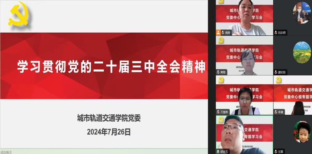 7月26日下午,城市轨道交通学院党委理论学习中心组在线专题学习党的二十届三中全会精神,学院党委中心组成员、教师代表等参加学习。学习由学院党委书记万慧琳主持。