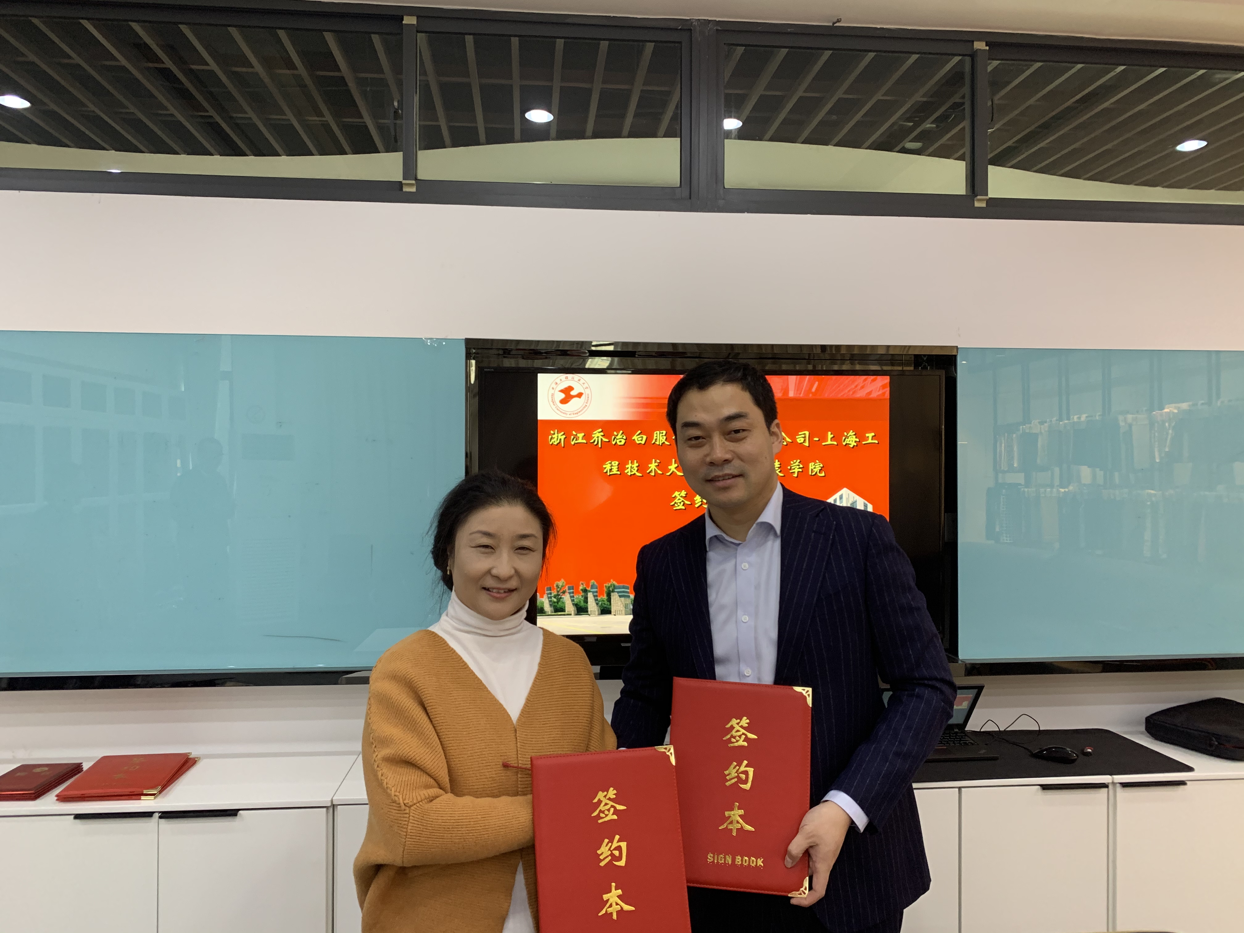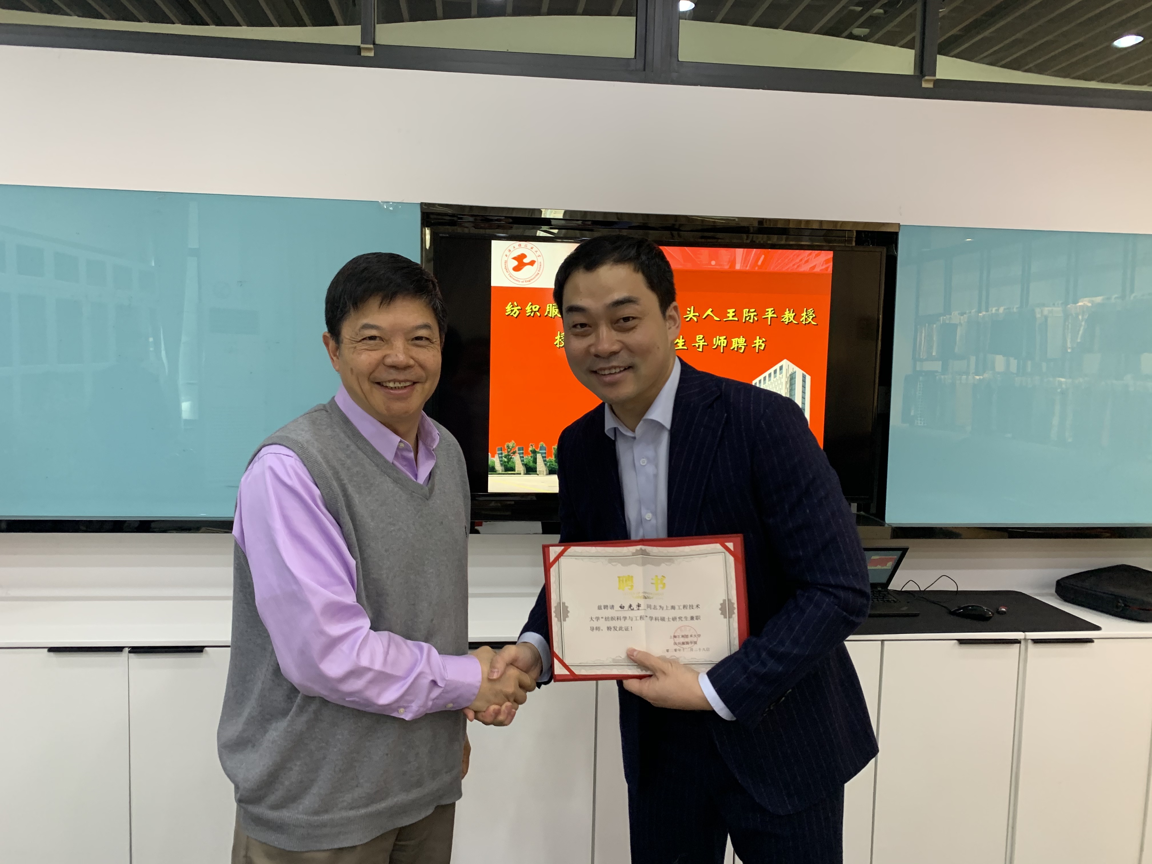 12月28日,浙江乔治白服饰股份有限公司池也董事长、上海乔治白实业有限公司池方燃董事长一行5人来纺织服装学院洽谈合作交流。双方在艺术楼C210会议室举行了签约仪式暨揭牌仪式,纺织服装学院党委书记朱君璇、院长谢红、副院长吴湘济、副院长辛斌杰、学科带头人王际平教授,以及沈勇教授和王黎明教授等参加了交流会,会议由辛斌杰副院长主持。