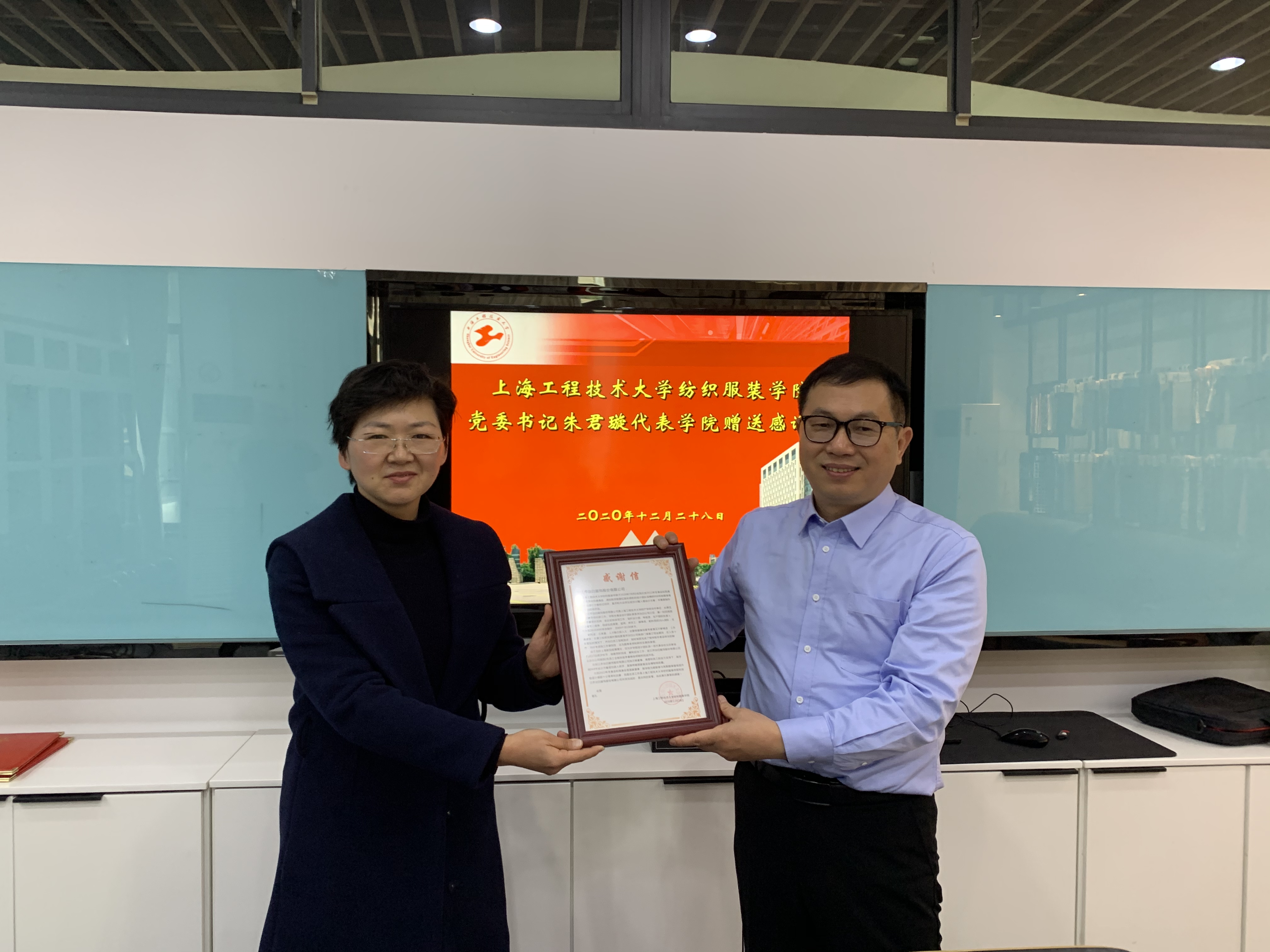 朱君璇书记代表学院向浙江乔治白服饰股份有限公司赠送感谢信,诚挚地感谢乔治白公司在学院参加北京2022年冬奥会和残奥会举办的制服装备视觉外观设计大赛期间给予的支持和帮助。
