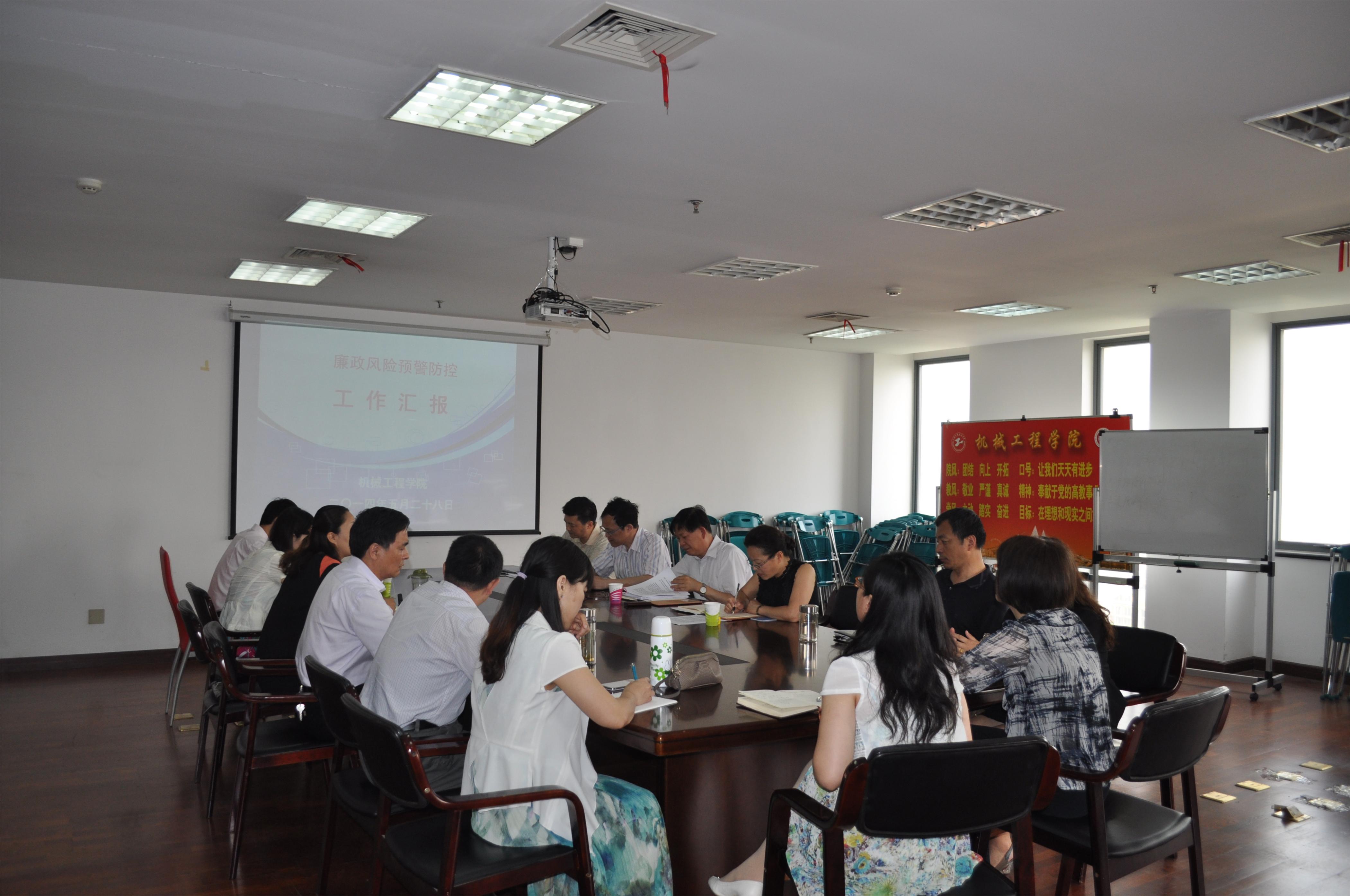 会议首先由机械工程学院党委书记虞蓉同志就本学院从4月以来开展的廉政风险预警工作进行了汇报,她从工作指导思想、工作思路、主要做法、初步成绩、问题及改进、今后打算六个方面进行了汇报。其次学院班子领导就此项工作开展谈了各自的想法和建议;再次,徐国祥同志对学院工作在全员参与、深入推进程度和结合学院特点具体问题梳理上提出要求。最后田书记进行讲话。他首先肯定了学院在近期工作的成果,各项工作根据校党委的统一要求和布置有序开展。同时强调,开展廉政风险防控必须结合学院的中心工作,必须通过建议完整的二级学院制度体系来规范各项工作,提高工作效率;在此基础上加强学院管理、决策、监督体系的设置,以不断提高学院各项工作的成效。