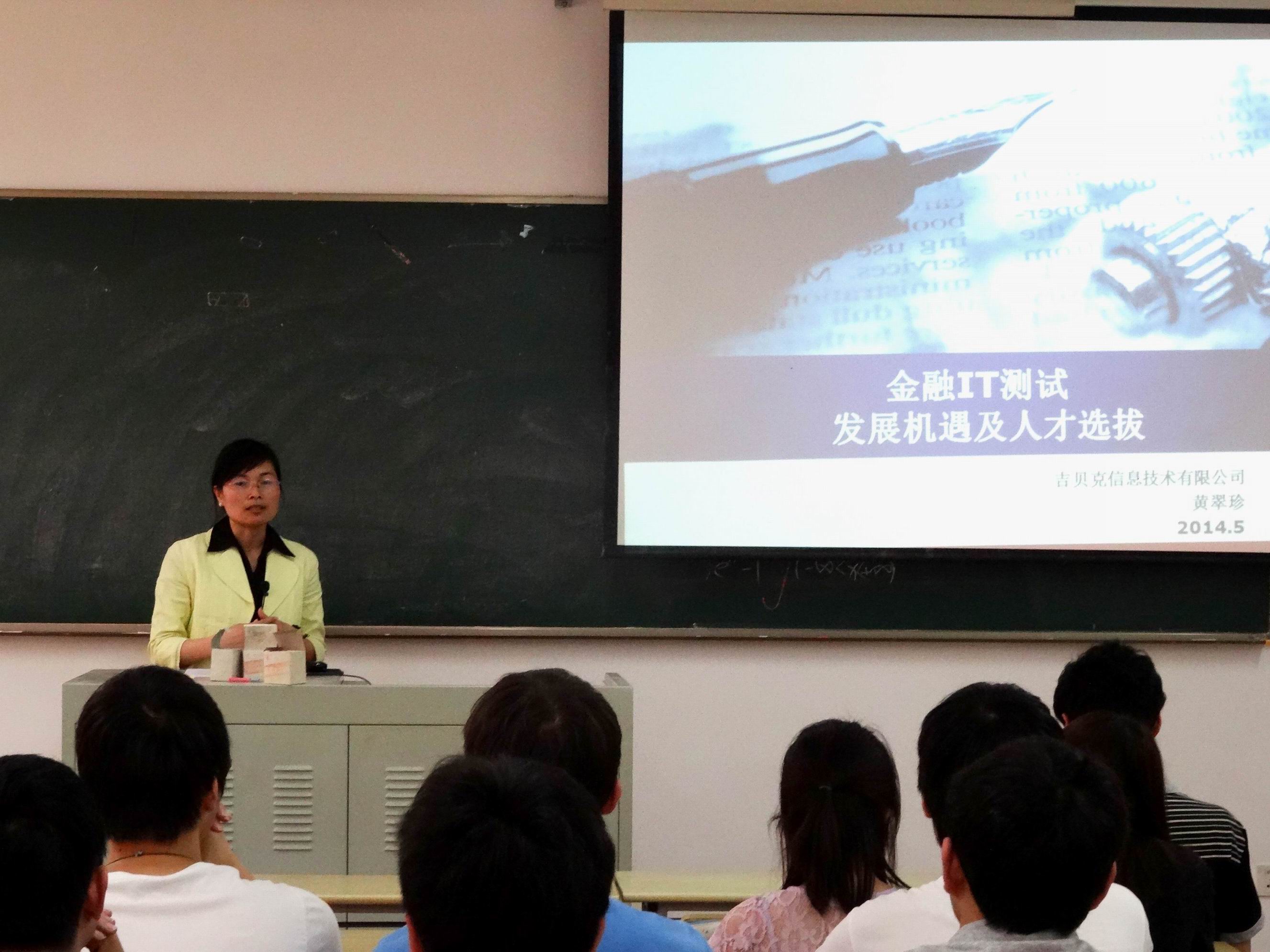 5月30日,上海吉贝克信息技术有限公司测试部总监黄翠珍女士受邀在教学楼D219开展了一次关于金融IT软件测试方面的专题讲座——《金融IT测试发展机遇及人才选拔》。电子电气工程学院相关教师和学生聆听了此次讲座。