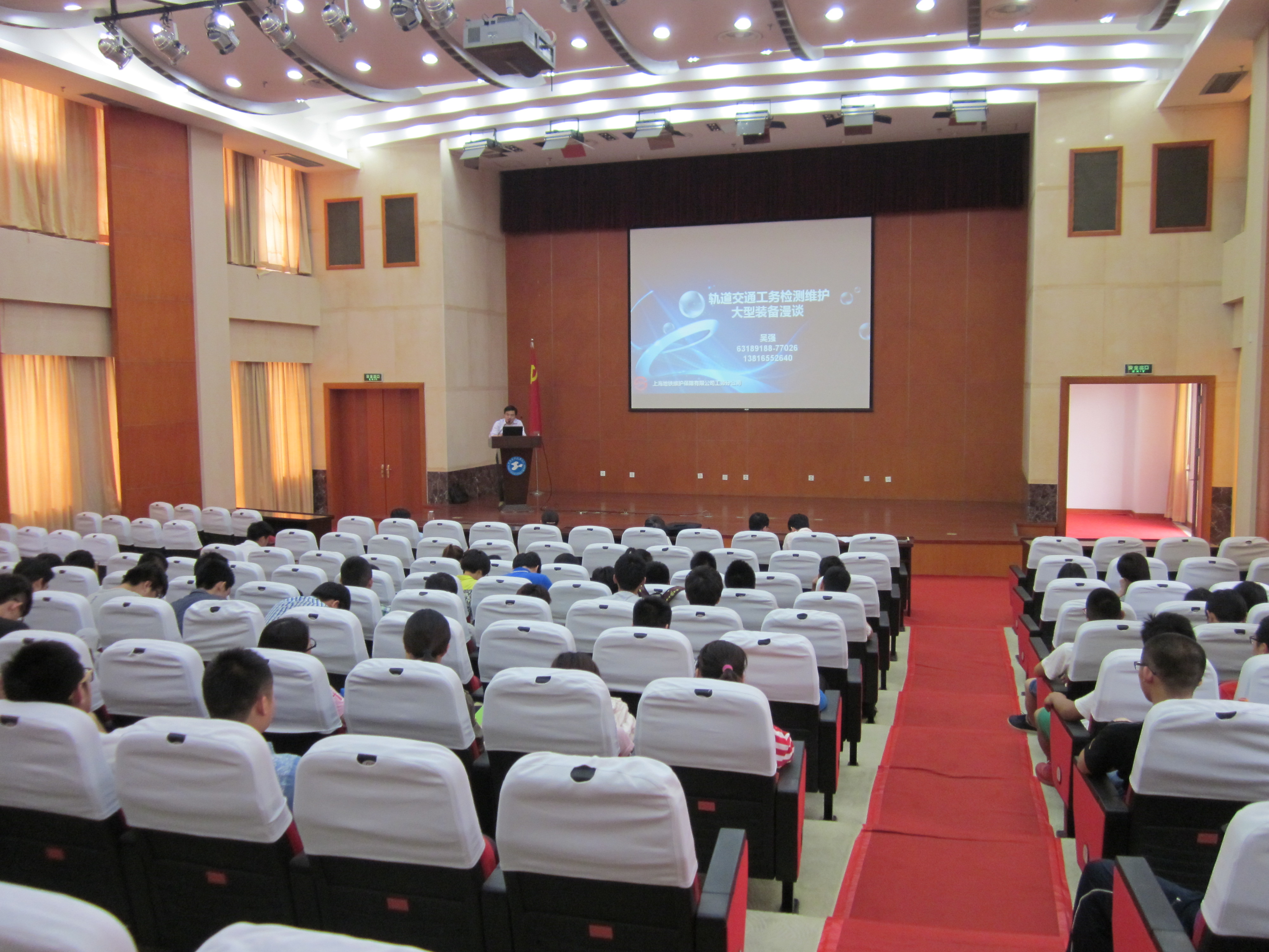 吴强工程师首先围绕“轨道交通工务检测维护大型装备漫谈”这一主题指出了目前上海轨道交通工务部门在检测过程中发现的问题,以及未来有待研究的方向,然后,结合自己多年的铁路工作经历详细阐述了上海地铁主要使用的大型检修装备:轨道检查车、钢轨探伤车、钢轨铣磨车、隧道清洗车、钢轨焊接车、桥梁检测车等,给大家带来了耳目一新的感觉。最后,吴强工程师向同学们讲述了交通工程专业在工务领域的工作内容以及发展,并鼓励同学们平时多阅读,多积累,谱写不同的人生篇章。吴强工程师风趣幽默的演讲让同学们沉醉其中,不时报以热烈的掌声,受益匪浅。