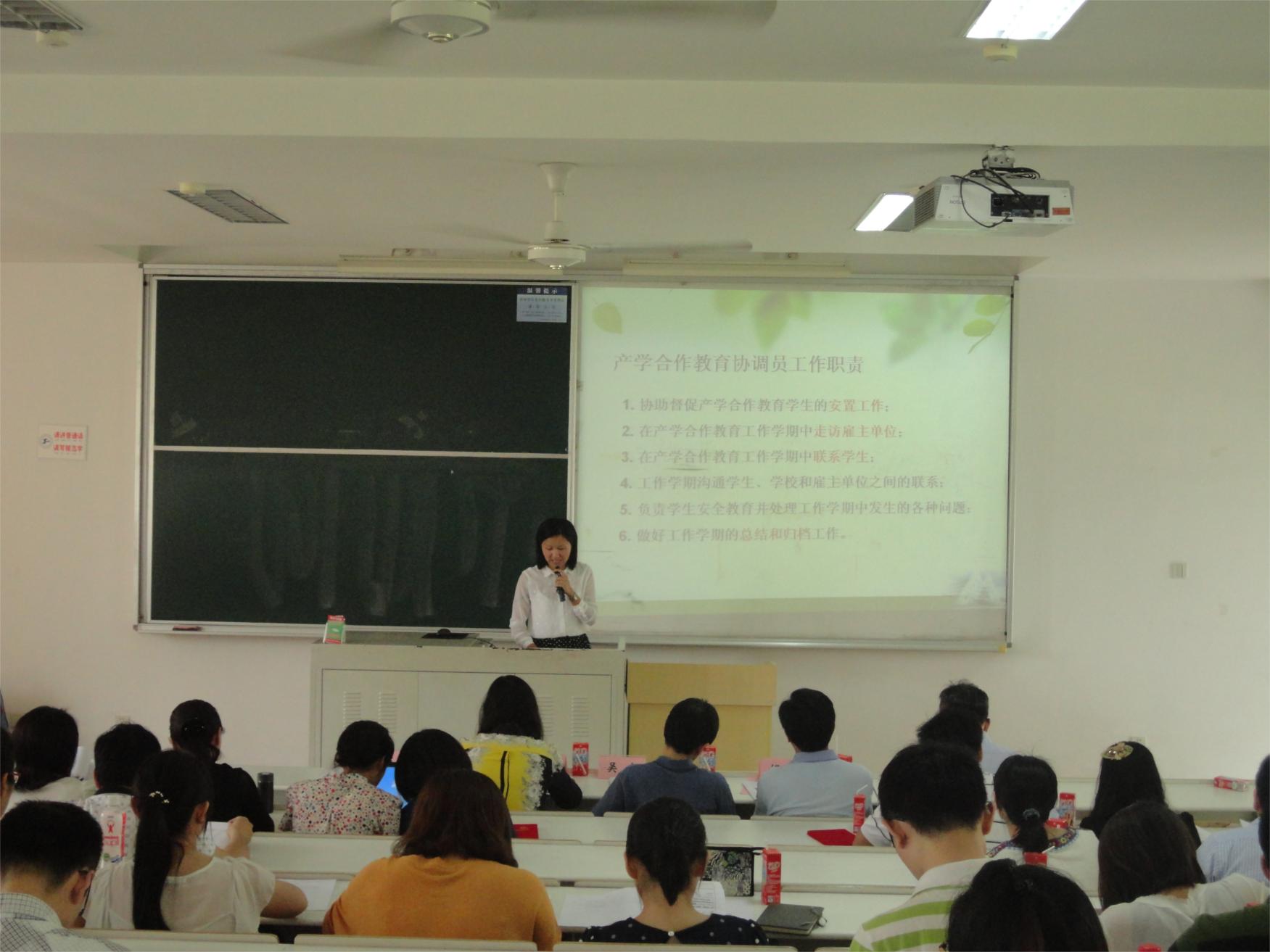 随后范君晖老师对今年的91名自愿报名的协调员老师和15名学生协调员进行了产学合作工作培训。范老师先后介绍了去年和今年学院产学合作教育基本情况,向各位老师们明确了今年产学合作教育在“质量年”背景下协调员工作的岗位职责、要求;范老师还提醒了协调员老师们开展工作过程中的注意事项、重要的时间节点等,并对今年工作中的新要求进行了解析。