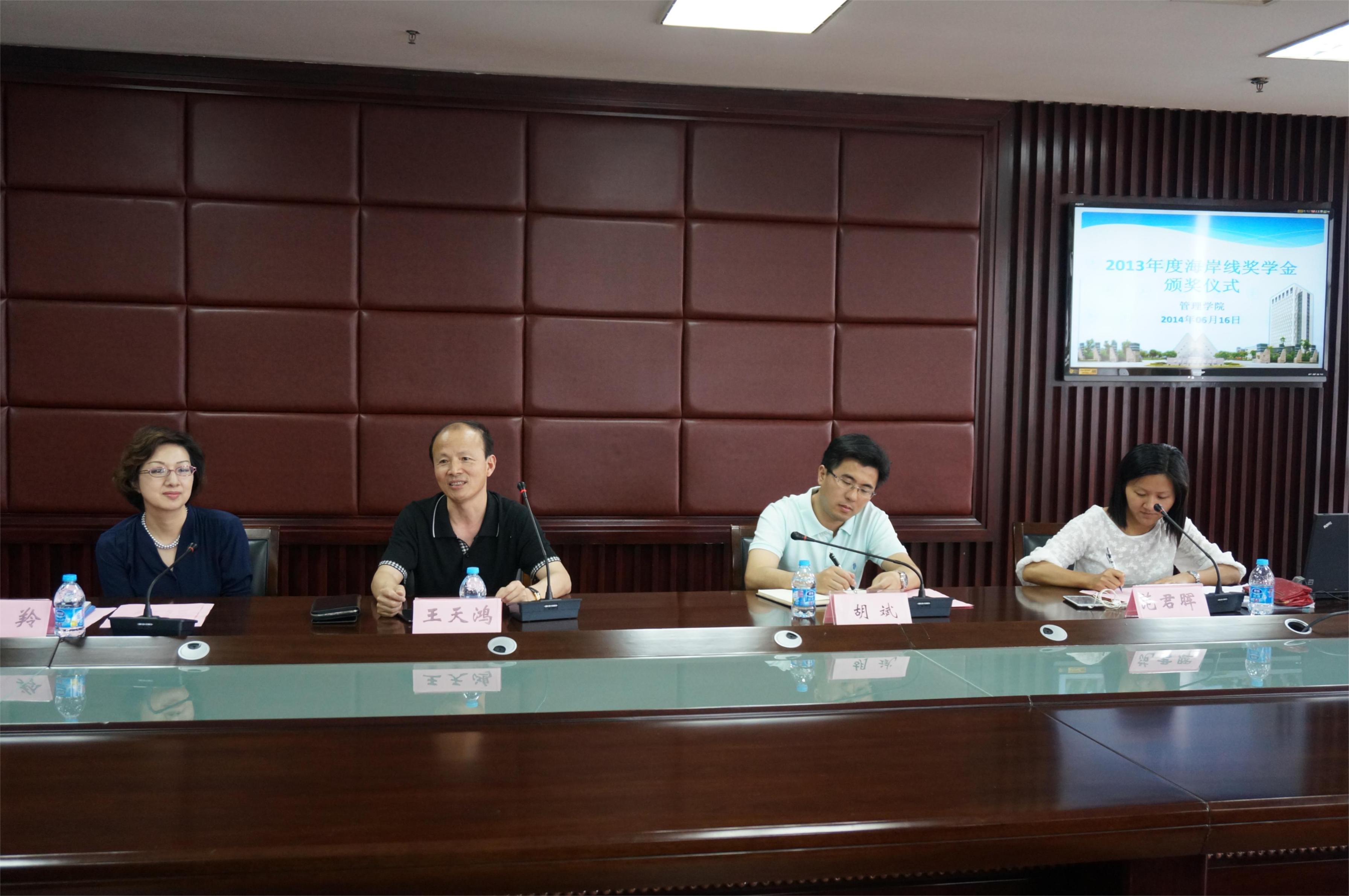 会上首先范君晖老师首先感谢了海岸线国际旅行社给予学生培养的关注和支持,也对海岸线国际旅行社的王天鸿经理表示了热烈的欢迎,随后胡斌副院长介绍了2013年度“海岸线”奖学金的评审背景及细则,并公布了此次海岸线奖学金评选的程序,并由管理学院邱羚副教授宣读了海岸线奖学金的获奖名单。会上由全体出席会议领导为获奖学生进行颁奖。