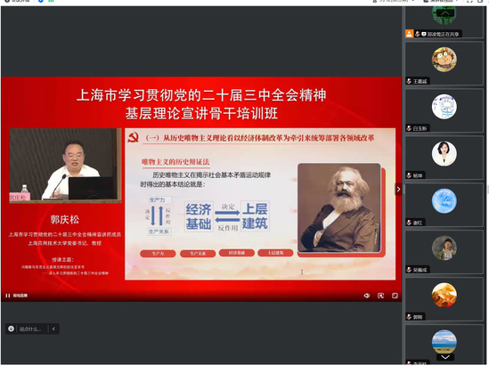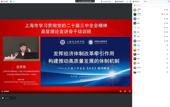 8月8日,上海市委讲师团办公室举办了上海市学习贯彻党的二十届三中全会精神基层理论宣讲骨干培训,郭庆松引导大家深刻学习贯彻党的二十届三中全会精神,沈开艳对党的二十届三中全会《决定》精神作了系统阐释和解读。科研处党支部通过腾讯会议召开支部大会并集中学习了两个报告。