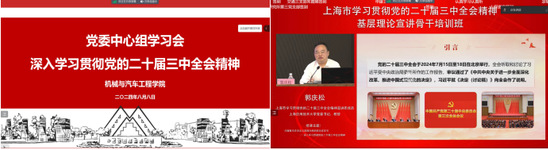 为深入学习党的二十届三中全会精神,深刻理解进一步全面深化改革的重大意义。8月8日,机械与汽车工程学院党委召开理论学习中心组学习会,线上参加了上海市举办的“学习贯彻党的二十届三中全会精神基层理论宣讲骨干培训班”,集中聆听了宣讲团成员郭庆松教授题为《闪耀着马克思主义真理光辉的政治宣言书——深入学习贯彻党的二十届三中全会精神》的宣讲报告。学院党委委员和班子成员参加学习,会议由党委书记虞蓉主持。