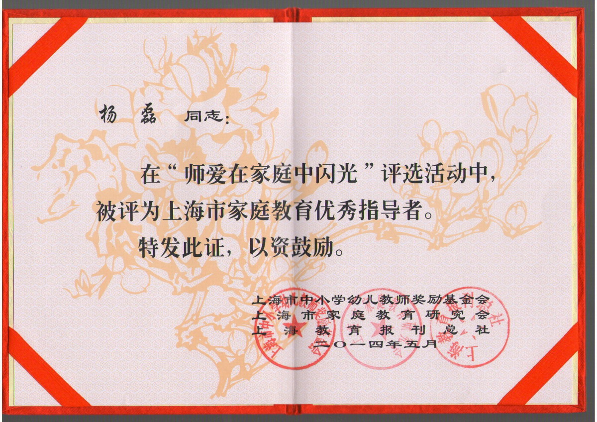 高职学院管理系、上海市高级技工学校杨磊同志在“师爱在家庭中闪光”评选活动中,被评为上海市家庭教育优秀指导者。